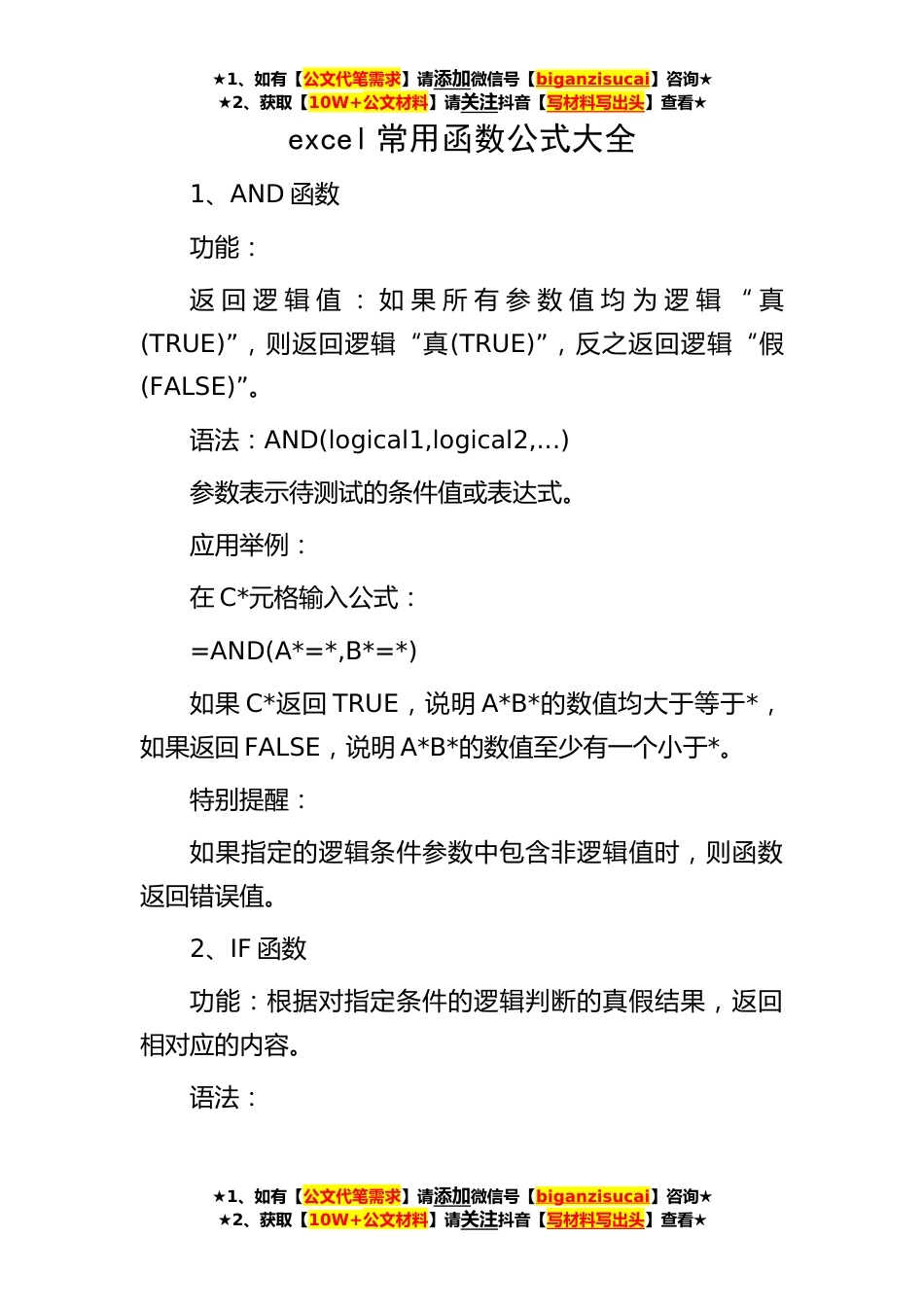 ★1、如有【公文代笔需求】请添加微信号【biganzisucai】咨询★★2、获取【10W+公文材料】请关注抖音【写材料写出头】查看★★1、如有【公文代笔需求】请添加微信号【biganzisucai】咨询★★2、获取【10W+公文材料】请关注抖音【写材料写出头】查看★★1、如有【公文代笔需求】请添加微信号【biganzisucai】咨询★★2、获取【10W+公文材料】请关注抖音【写材料写出头】查看★excel常用函数公式大全1、AND函数功能:返回逻辑值:如果所有参数值均为逻辑“真(TRUE)”,则返回逻辑“真(TRUE)”,反之返回逻辑“假(FALSE)”。语法:AND(logical1,logical2,...)参数表示待测试的条件值或表达式。应用举例:在C*元格输入公式:=AND(A*=*,B*=*)如果C*返回TRUE,说明A*B*的数值均大于等于*,如果返回FALSE,说明A*B*的数值...