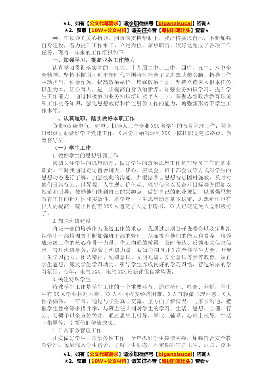 ★1、如有【公文代笔需求】请添加微信号【biganzisucai】咨询★★2、获取【10W+公文材料】请关注抖音【写材料写出头】查看★**,在领导的关心指导、同事的支持帮助下,我严格要求自己,不断加强自身建设,着力提升工作水平,立足岗位,聚焦职责,较好地完成了各项工作任务。现将一年来的工作汇报如下:一、加强学习,提高业务工作能力认真学习贯彻落实党的十九大、十九届二中、三中、四中、五中、六中全会精神,坚持不懈用习近平新时代中国特色社会主义思想武装头脑、指导工作,主动担当,积极作为,提高政治站位,增强政治自觉。坚持立德树人根本任务,以生为本,倾心育人,进一步提高自身政治素养。加强业务知识学习,提升学生工作能力。通过积极参加业务知识培训及个人自学,掌握思想政治教育理论和工作实务知...