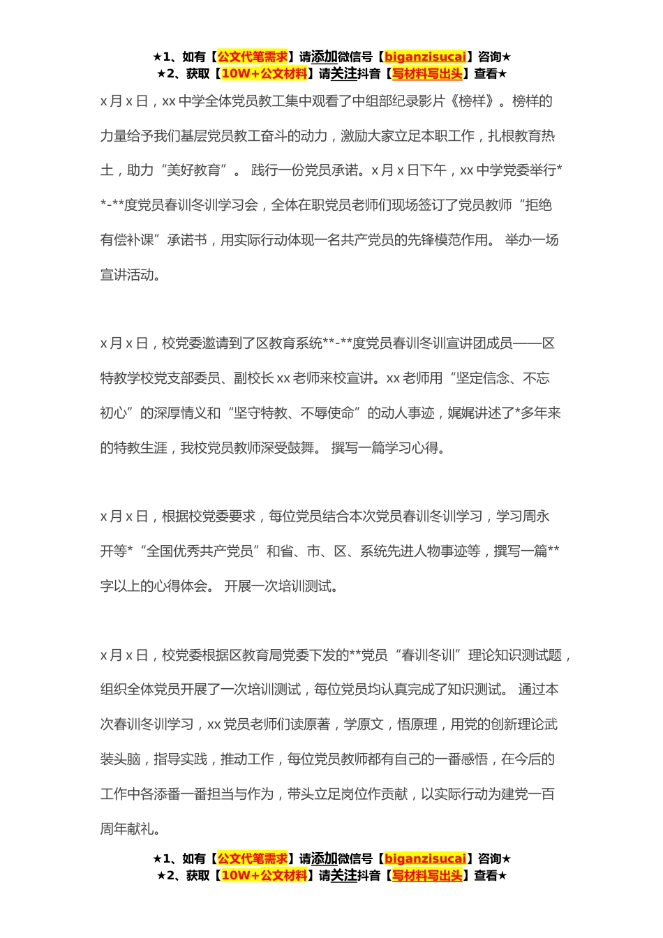 ★1、如有【公文代笔需求】请添加微信号【biganzisucai】咨询★★2、获取【10W+公文材料】请关注抖音【写材料写出头】查看★xx中学党委根据区教育局党委关于做好xx区教育系统**~**度党员春训冬训工作的通知要求,于*XX年*月下旬开始至***,组织党员开展集中培训。学习一次新思想。x月x日下午,校党委举行**-**度党员春训冬训学习会,全体党员教师们进行了新思想云课堂学习,在线收了派驻纪监组xx老师的主题讲座《立德树人,从守纪律讲规矩开始》。上好一节专题党课。x月x日下午,校党委召开全体党员大会进行专题党课学习。由xx文科第二党支部书记、政治教研组长xx老师主讲。朱老师从明理、增信、崇德、力行四方面向我们讲述了百年党史。开展一次廉政教育。x月x日下午,校党委组织党员教师前往xx省法纪教育基地,...