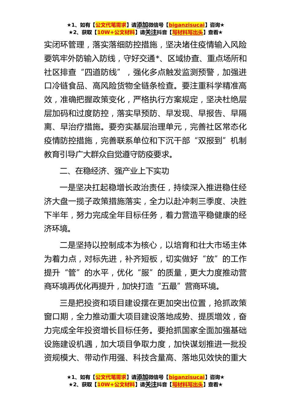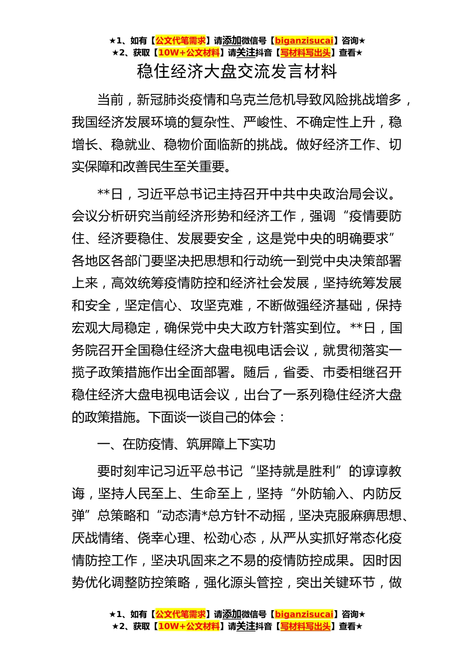 ★1、如有【公文代笔需求】请添加微信号【biganzisucai】咨询★★2、获取【10W+公文材料】请关注抖音【写材料写出头】查看★稳住经济大盘交流发言材料当前,新冠肺炎疫情和乌克兰危机导致风险挑战增多,我国经济发展环境的复杂性、严峻性、不确定性上升,稳增长、稳就业、稳物价面临新的挑战。做好经济工作、切实保障和改善民生至关重要。**日,习近平总书记主持召开中共中央政治局会议。会议分析研究当前经济形势和经济工作,强调“疫情要防住、经济要稳住、发展要安全,这是党中央的明确要求”各地区各部门要坚决把思想和行动统一到党中央决策部署上来,高效统筹疫情防控和经济社会发展,坚持统筹发展和安全,坚定信心、攻坚克难,不断做强经济基础,保持宏观大局稳定,确保党中央大政方针落实到位。**日,国务...