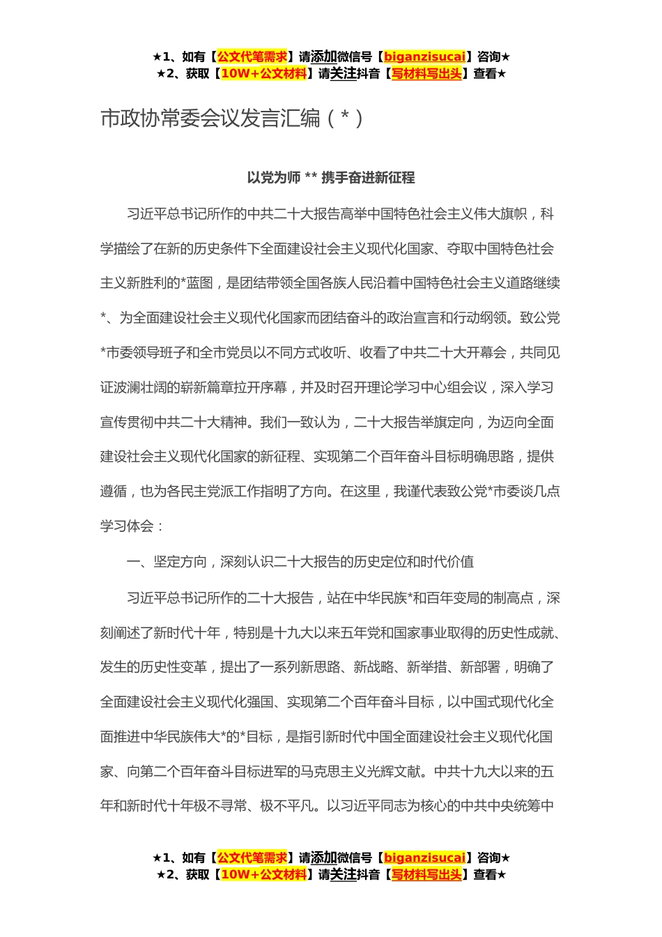 ★1、如有【公文代笔需求】请添加微信号【biganzisucai】咨询★★2、获取【10W+公文材料】请关注抖音【写材料写出头】查看★市政协常委会议发言汇编(*)以党为师**携手奋进新征程习近平总书记所作的中共二十大报告高举中国特色社会主义伟大旗帜,科学描绘了在新的历史条件下全面建设社会主义现代化国家、夺取中国特色社会主义新胜利的*蓝图,是团结带领全国各族人民沿着中国特色社会主义道路继续*、为全面建设社会主义现代化国家而团结奋斗的政治宣言和行动纲领。致公党*市委领导班子和全市党员以不同方式收听、收看了中共二十大开幕会,共同见证波澜壮阔的崭新篇章拉开序幕,并及时召开理论学习中心组会议,深入学习宣传贯彻中共二十大精神。我们一致认为,二十大报告举旗定向,为迈向全面建设社会主义现代化国...