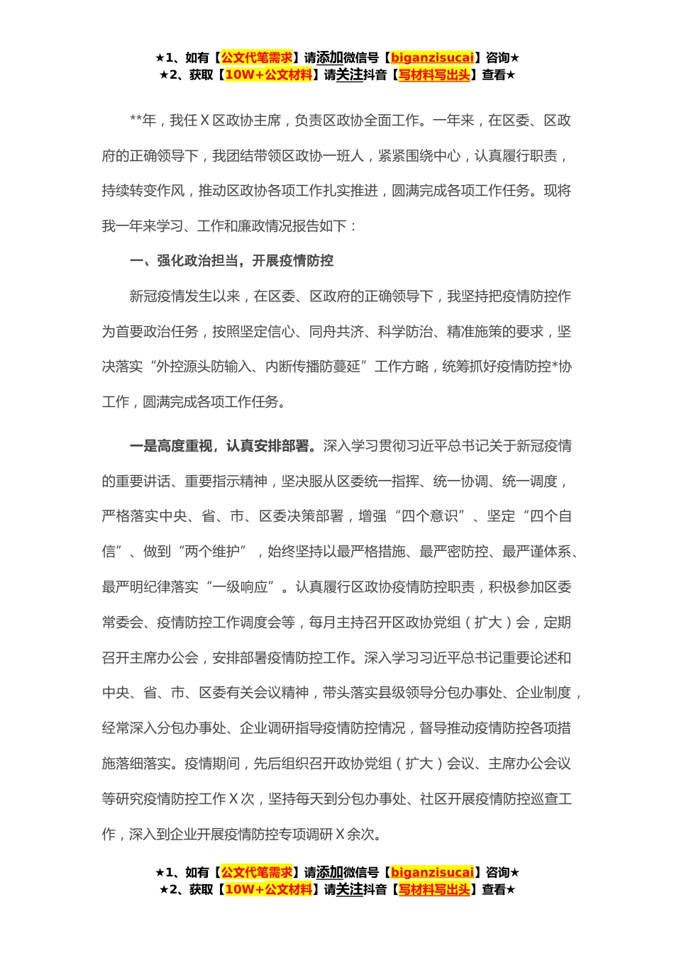 ★1、如有【公文代笔需求】请添加微信号【biganzisucai】咨询★★2、获取【10W+公文材料】请关注抖音【写材料写出头】查看★**年,我任X区政协主席,负责区政协全面工作。一年来,在区委、区政府的正确领导下,我团结带领区政协一班人,紧紧围绕中心,认真履行职责,持续转变作风,推动区政协各项工作扎实推进,圆满完成各项工作任务。现将我一年来学习、工作和廉政情况报告如下:一、强化政治担当,开展疫情防控新冠疫情发生以来,在区委、区政府的正确领导下,我坚持把疫情防控作为首要政治任务,按照坚定信心、同舟共济、科学防治、精准施策的要求,坚决落实“外控源头防输入、内断传播防蔓延”工作方略,统筹抓好疫情防控*协工作,圆满完成各项工作任务。一是高度重视,认真安排部署。深入学习贯彻习近平总书...