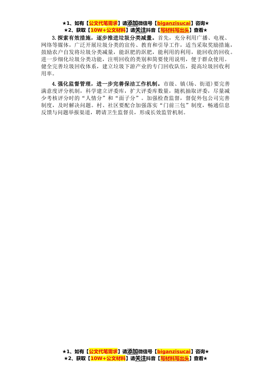 ★1、如有【公文代笔需求】请添加微信号【biganzisucai】咨询★★2、获取【10W+公文材料】请关注抖音【写材料写出头】查看★**,市委、市政府高度重视农村人居环境治理,元月至*投入**万元,清除陈年垃圾,取缔非法填埋场。投入**万元,建成了*个垃圾中转站。*份以**万元的价格通过招标方式购买服务,确定了朗洁和益环两家服务公司,自此实现了我市农村生活垃圾治理工作的全域外包。截止目前,两家公司共聘用工作人员**名,配备各种环卫车辆*多台,大小打捞船*多艘,日常保洁车**台,大型垃圾收集箱近**。通过市镇村三级联动,全市农村人居环境得到改观,农村面貌焕然一新,农民幸福指数大幅提升,但也存在一些不容忽视的问题。1.群众环保意识有待提升。部分群众环保意识不强,卫生意识欠缺,对日常保洁参与度不高...