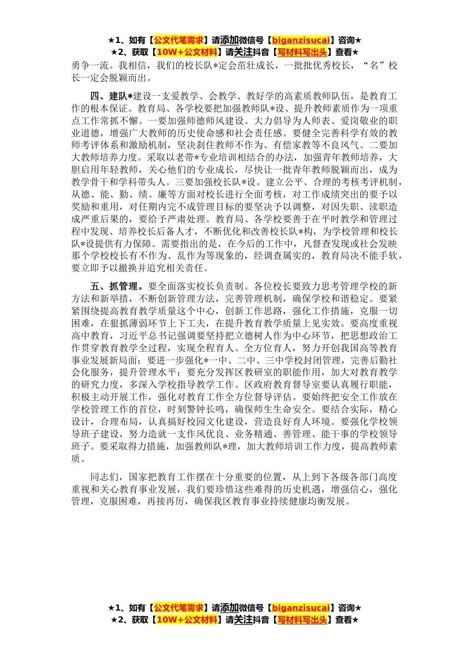 ★1、如有【公文代笔需求】请添加微信号【biganzisucai】咨询★★2、获取【10W+公文材料】请关注抖音【写材料写出头】查看★各位校长:刚才,局长和副局长分别讲了很好的意见,我完全赞同。借次机会,我讲几点意见,希望各位校认真落实。教育是一项基础的社会系统工程,教育之于个人的成长和地方的发展,乃至于国家和民族的未来作用重大。由于全区上下的共同努力,我区教育工作已经奠定了一个较好的基础,但在这信息化的全新时代,我们不能有丝毫的懈怠。只有不断探索、不断创新、不断提升,才能实现区委、区政府提出教育各项目标。而在这过程中,校长的作用至关重要。俗话说,有一位好校长就有一所好的学校。那么如何当好一个校长呢?我概括为一句话:勤学习、会做人、善干事、建队伍、抓管理。一、勤学习。校长要...