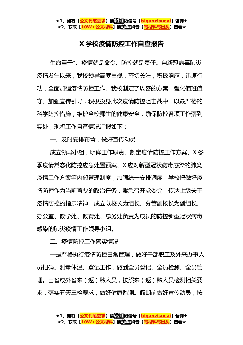 ★1、如有【公文代笔需求】请添加微信号【biganzisucai】咨询★★2、获取【10W+公文材料】请关注抖音【写材料写出头】查看★X学校疫情防控工作自查报告生命重于*、疫情就是命令、防控就是责任。自新冠病毒肺炎疫情发生以来,我校领导高度重视,密切关注,积极响应,迅速行动,全面加强疫情防控工作。我校制定了周密的方案,强化值班值守、加强宣传引导,积极投身此次疫情防控阻击战中,以最严格的科学防控措施,维护全校师生的健康安全,确保防控各项工作落到实处,现将工作自查情况汇报如下:一、及时安排布置,做好宣传动员成立领导小组,明确工作职责。制定疫情防控工作方案、X冬季疫情常态化防控应急处置预案、X应对新型冠状病毒感染的肺炎疫情工作方案等内部管理制度,加强统一安排调度。学校把做好疫情防控...