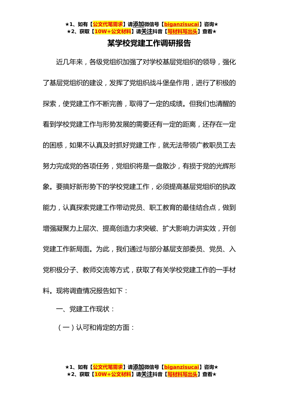 ★1、如有【公文代笔需求】请添加微信号【biganzisucai】咨询★★2、获取【10W+公文材料】请关注抖音【写材料写出头】查看★某学校党建工作调研报告近几年来,各级党组织加强了对学校基层党组织的领导,强化了基层党组织的建设,发挥了党组织战斗堡垒作用,进行了积极的探索,使党建工作不断完善,取得了一定的成绩。但我们也清醒的看到学校党建工作与形势发展的需要还有一定的距离,还存在一定的困惑,如果不认真及时抓好党建工作,就无法带领广教职员工去努力完成党的各项任务,党组织将是一盘散沙,有损于党的光辉形象。要搞好新形势下的学校党建工作,必须提高基层党组织的执政能力,认真探索党建工作带动党员、职工教育的最佳结合点,做到增强凝聚力上层次、提高创造力求突破、扩大影响力讲实效,开创党建工...