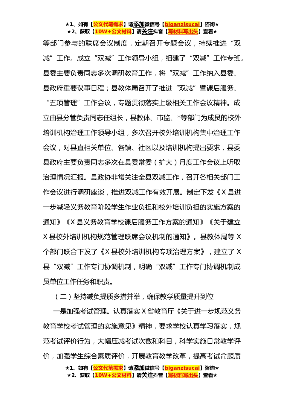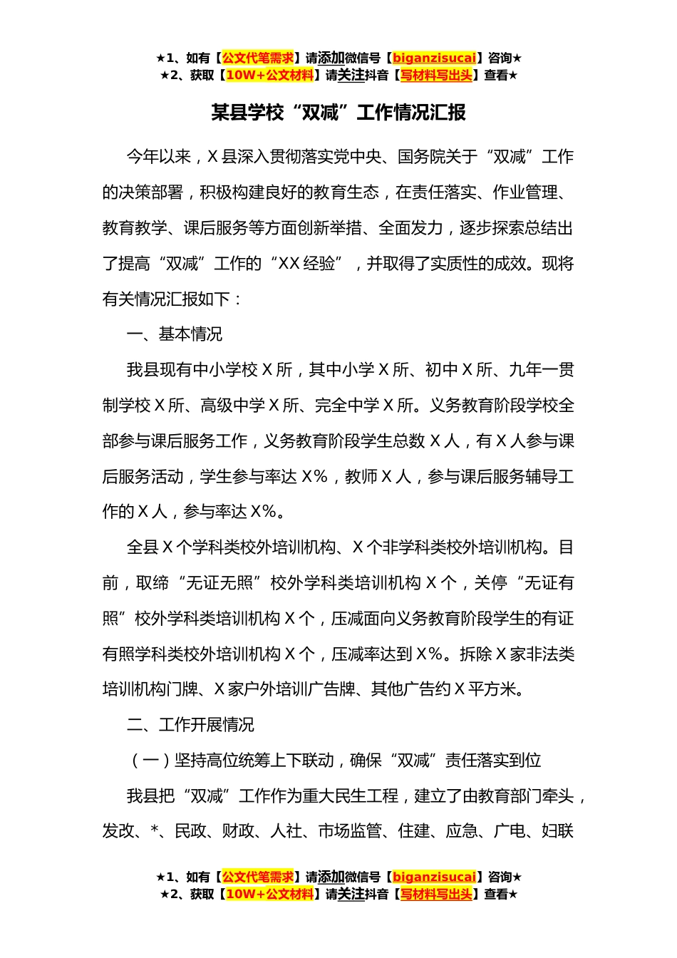 ★1、如有【公文代笔需求】请添加微信号【biganzisucai】咨询★★2、获取【10W+公文材料】请关注抖音【写材料写出头】查看★某县学校“双减”工作情况汇报今年以来,X县深入贯彻落实党中央、国务院关于“双减”工作的决策部署,积极构建良好的教育生态,在责任落实、作业管理、教育教学、课后服务等方面创新举措、全面发力,逐步探索总结出了提高“双减”工作的“XX经验”,并取得了实质性的成效。现将有关情况汇报如下:一、基本情况我县现有中小学校X所,其中小学X所、初中X所、九年一贯制学校X所、高级中学X所、完全中学X所。义务教育阶段学校全部参与课后服务工作,义务教育阶段学生总数X人,有X人参与课后服务活动,学生参与率达X%,教师X人,参与课后服务辅导工作的X人,参与率达X%。全县X个学科类校外培...