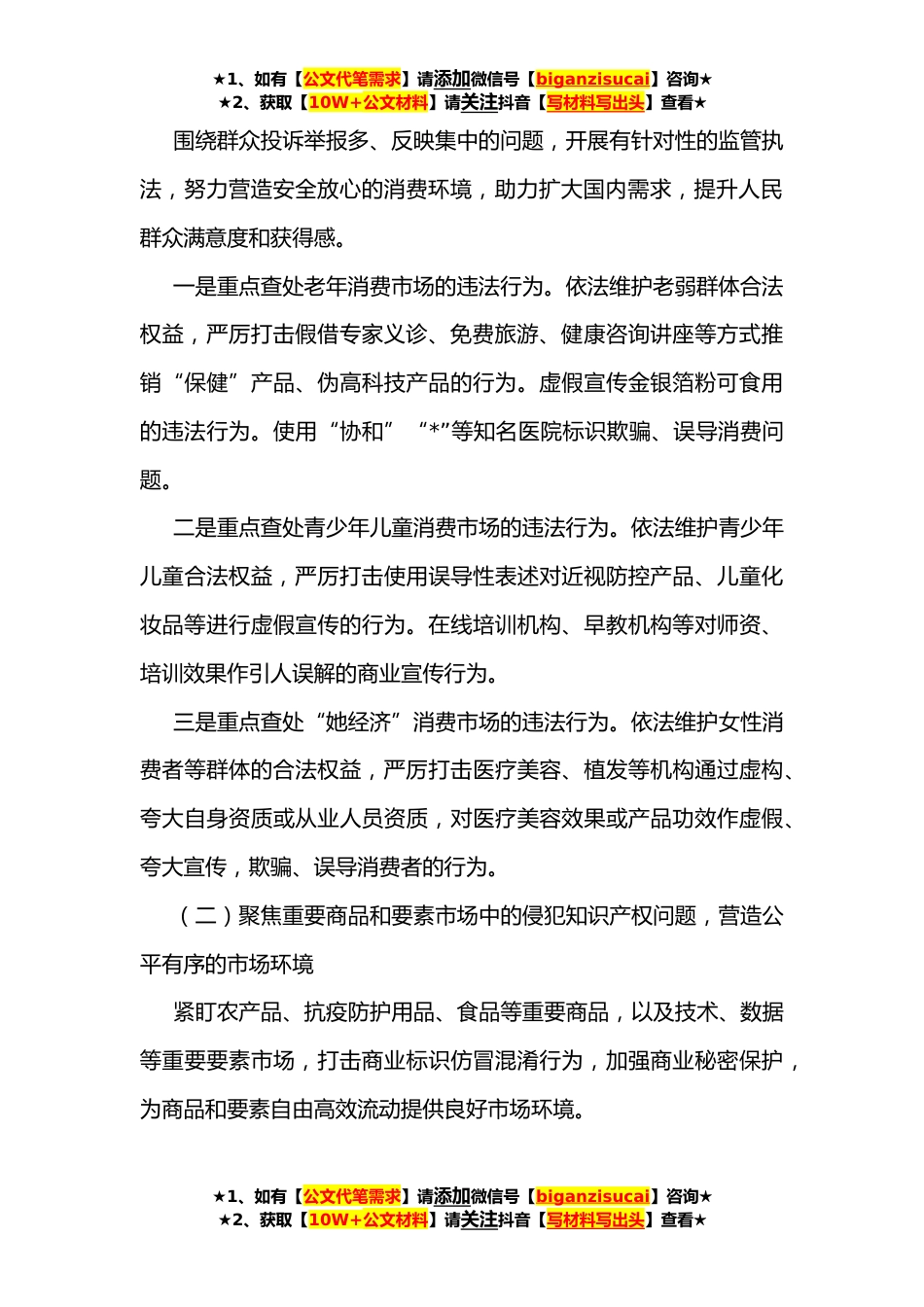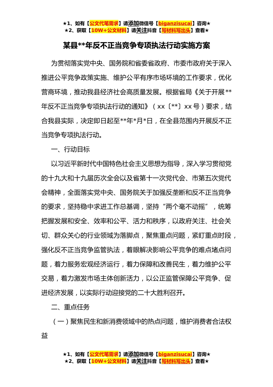 ★1、如有【公文代笔需求】请添加微信号【biganzisucai】咨询★★2、获取【10W+公文材料】请关注抖音【写材料写出头】查看★某县**年反不正当竞争专项执法行动实施方案为贯彻落实党中央、国务院和省委省政府、市委市政府关于深入推进公平竞争政策实施、维护公平有序市场环境的工作要求,优化营商环境,推动我县经济社会高质量发展。根据省局《关于开展**年反不正当竞争专项执法行动的通知》(xx〔**〕xx号)要求,结合我县实际,决定即日起至**年*月*日,在全县范围内开展反不正当竞争专项执法行动。一、行动目标以习近平新时代中国特色社会主义思想为指导,深入学习贯彻党的十九大和十九届历次全会以及省第十一次党代会、市第五次党代会精神,全面落实党中央、国务院关于加强反垄断和反不正当竞争的要求,坚持稳...