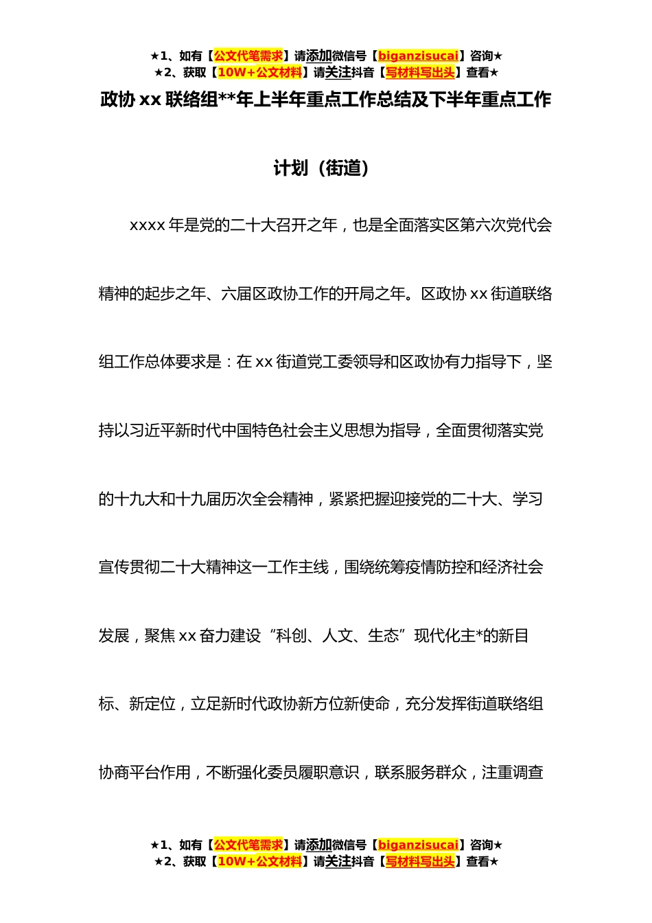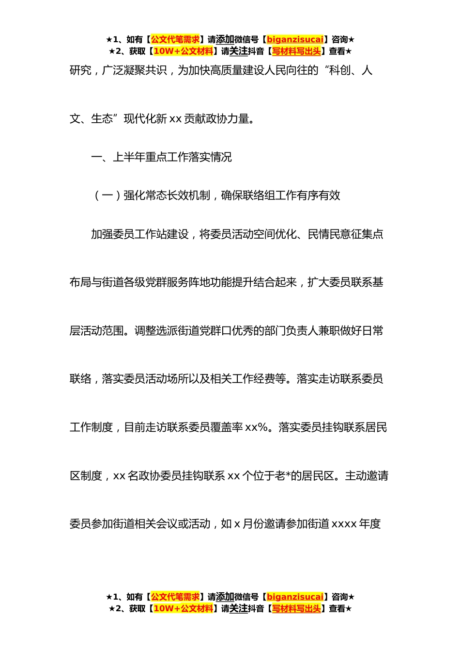 ★1、如有【公文代笔需求】请添加微信号【biganzisucai】咨询★★2、获取【10W+公文材料】请关注抖音【写材料写出头】查看★政协xx联络组**年上半年重点工作总结及下半年重点工作计划(街道)xxxx年是党的二十大召开之年,也是全面落实区第六次党代会精神的起步之年、六届区政协工作的开局之年。区政协xx街道联络组工作总体要求是:在xx街道党工委领导和区政协有力指导下,坚持以习近平新时代中国特色社会主义思想为指导,全面贯彻落实党的十九大和十九届历次全会精神,紧紧把握迎接党的二十大、学习宣传贯彻二十大精神这一工作主线,围绕统筹疫情防控和经济社会发展,聚焦xx奋力建设“科创、人文、生态”现代化主*的新目标、新定位,立足新时代政协新方位新使命,充分发挥街道联络组协商平台作用,不断强化委员履...
