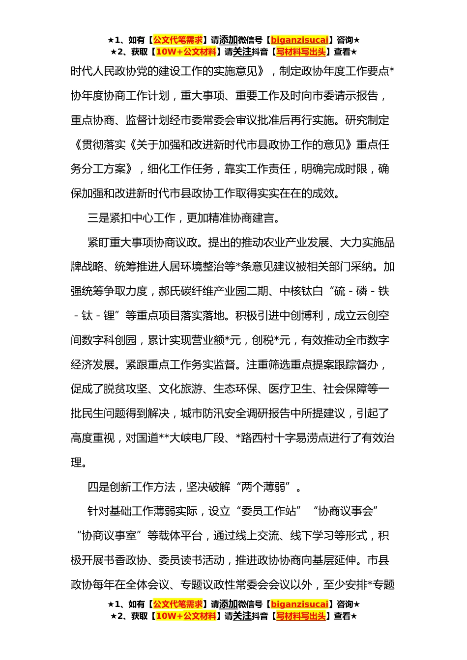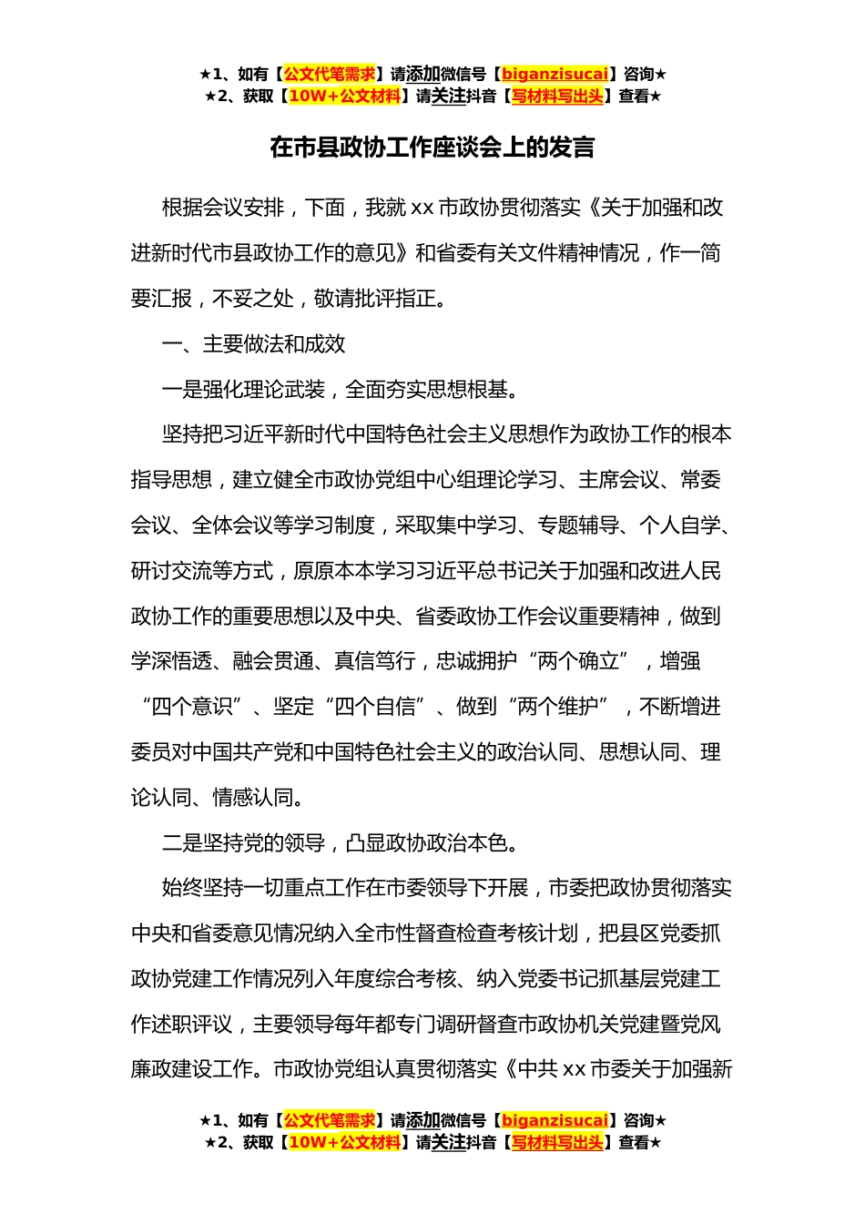 ★1、如有【公文代笔需求】请添加微信号【biganzisucai】咨询★★2、获取【10W+公文材料】请关注抖音【写材料写出头】查看★在市县政协工作座谈会上的发言根据会议安排,下面,我就xx市政协贯彻落实《关于加强和改进新时代市县政协工作的意见》和省委有关文件精神情况,作一简要汇报,不妥之处,敬请批评指正。一、主要做法和成效一是强化理论武装,全面夯实思想根基。坚持把习近平新时代中国特色社会主义思想作为政协工作的根本指导思想,建立健全市政协党组中心组理论学习、主席会议、常委会议、全体会议等学习制度,采取集中学习、专题辅导、个人自学、研讨交流等方式,原原本本学习习近平总书记关于加强和改进人民政协工作的重要思想以及中央、省委政协工作会议重要精神,做到学深悟透、融会贯通、真信笃行,...