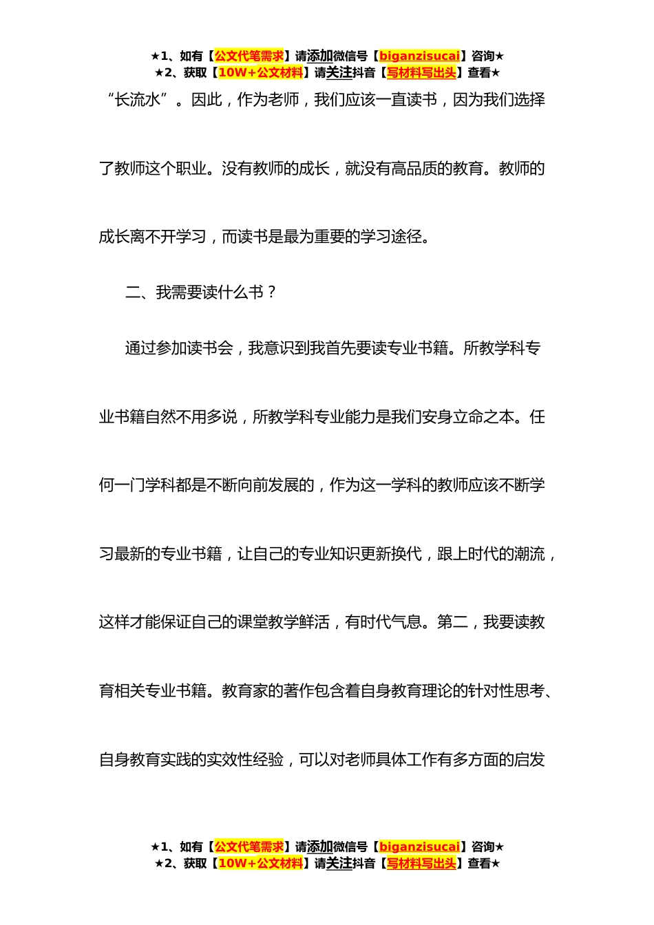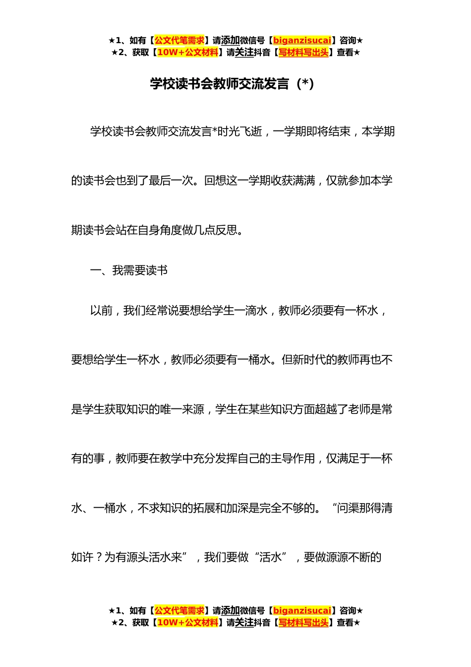 ★1、如有【公文代笔需求】请添加微信号【biganzisucai】咨询★★2、获取【10W+公文材料】请关注抖音【写材料写出头】查看★学校读书会教师交流发言(*)学校读书会教师交流发言*时光飞逝,一学期即将结束,本学期的读书会也到了最后一次。回想这一学期收获满满,仅就参加本学期读书会站在自身角度做几点反思。一、我需要读书以前,我们经常说要想给学生一滴水,教师必须要有一杯水,要想给学生一杯水,教师必须要有一桶水。但新时代的教师再也不是学生获取知识的唯一来源,学生在某些知识方面超越了老师是常有的事,教师要在教学中充分发挥自己的主导作用,仅满足于一杯水、一桶水,不求知识的拓展和加深是完全不够的。“问渠那得清如许?为有源头活水来”,我们要做“活水”,要做源源不断的★1、如有【公文代笔...