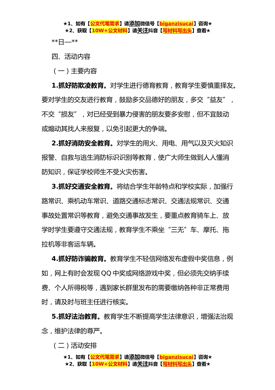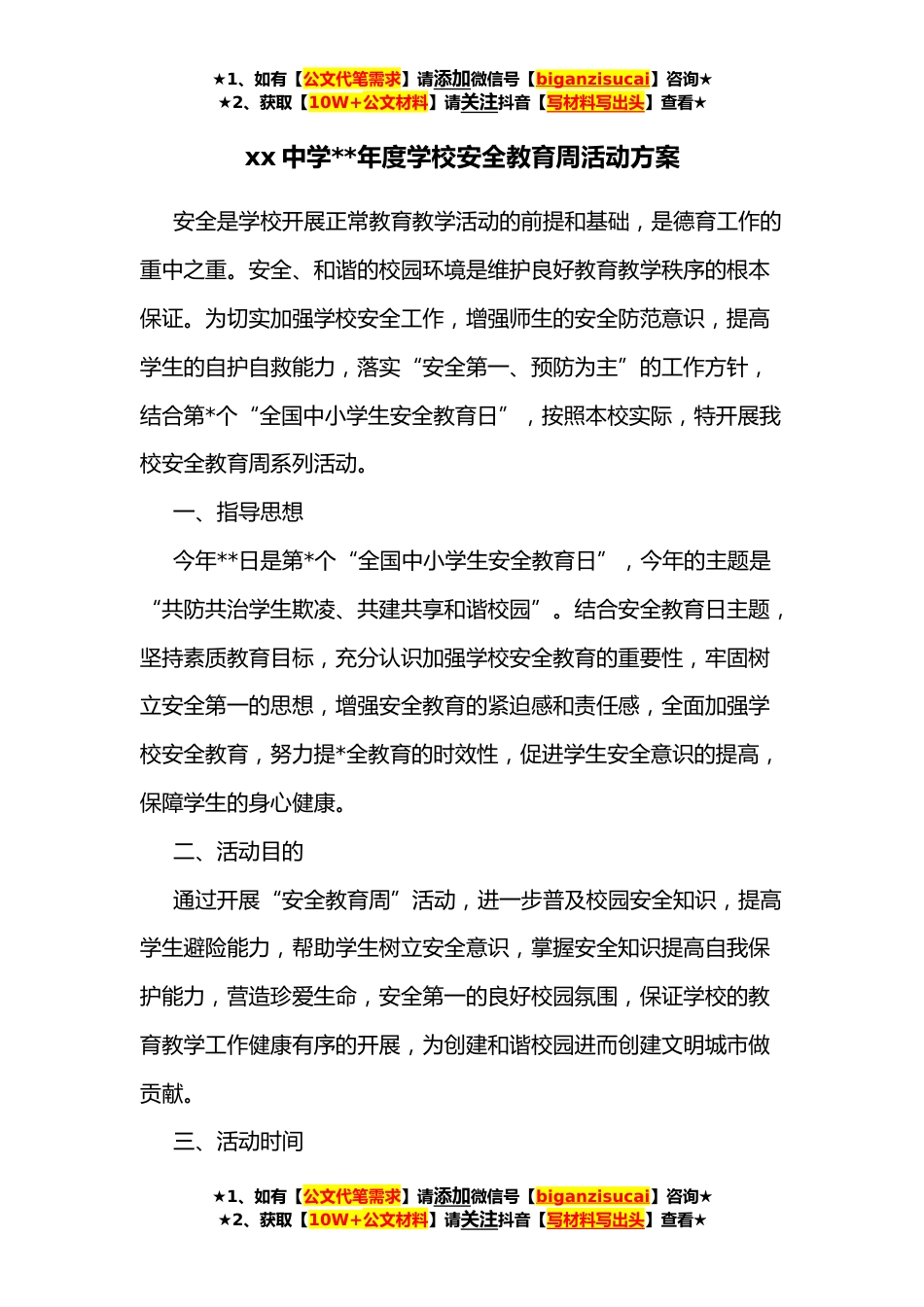 ★1、如有【公文代笔需求】请添加微信号【biganzisucai】咨询★★2、获取【10W+公文材料】请关注抖音【写材料写出头】查看★xx中学**年度学校安全教育周活动方案安全是学校开展正常教育教学活动的前提和基础,是德育工作的重中之重。安全、和谐的校园环境是维护良好教育教学秩序的根本保证。为切实加强学校安全工作,增强师生的安全防范意识,提高学生的自护自救能力,落实“安全第一、预防为主”的工作方针,结合第*个“全国中小学生安全教育日”,按照本校实际,特开展我校安全教育周系列活动。一、指导思想今年**日是第*个“全国中小学生安全教育日”,今年的主题是“共防共治学生欺凌、共建共享和谐校园”。结合安全教育日主题,坚持素质教育目标,充分认识加强学校安全教育的重要性,牢固树立安全第一的思想...