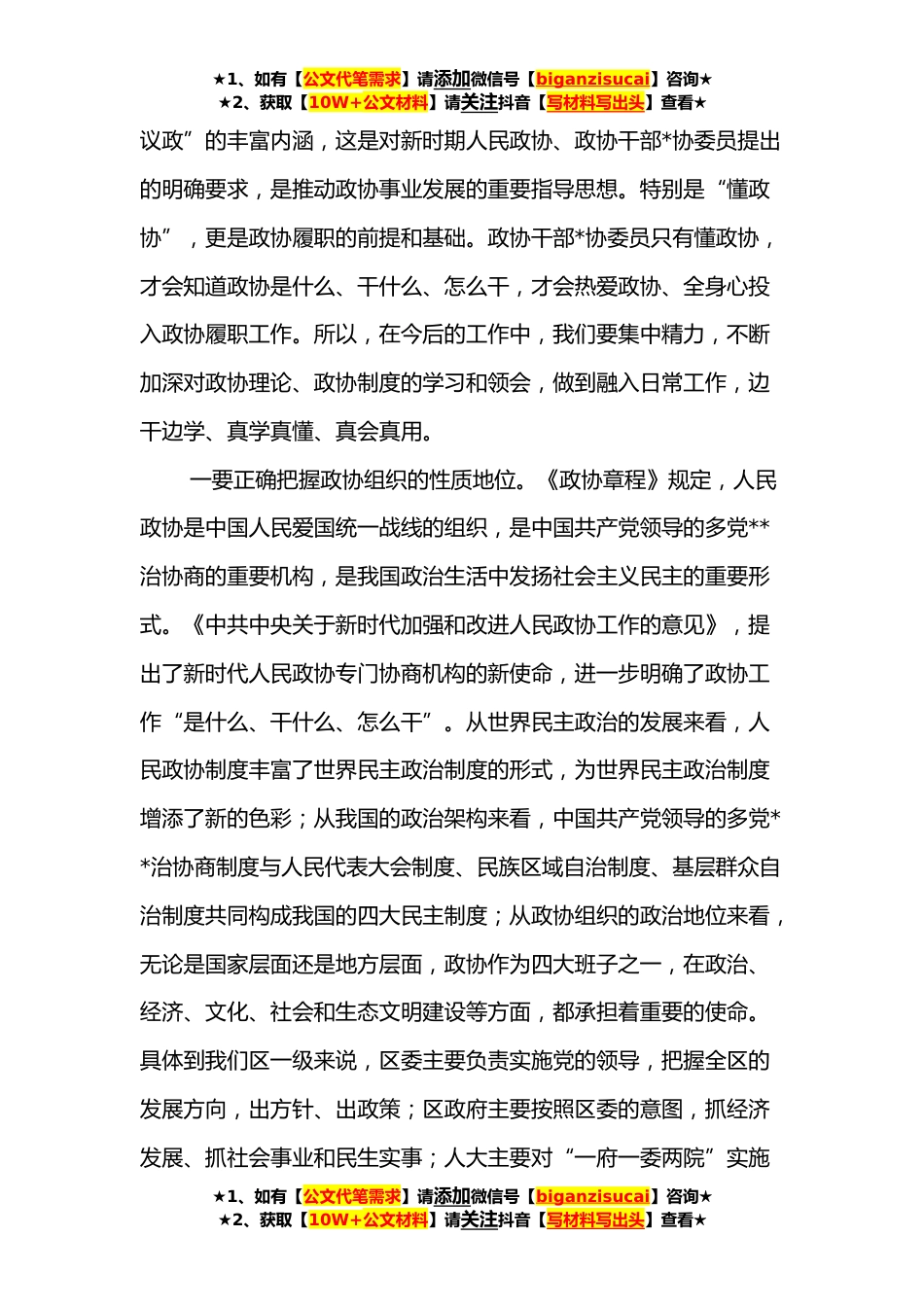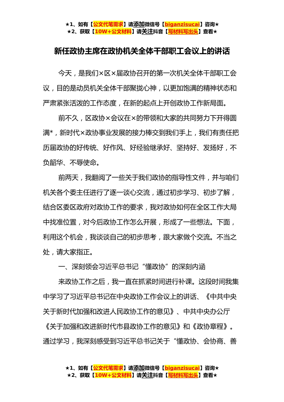 ★1、如有【公文代笔需求】请添加微信号【biganzisucai】咨询★★2、获取【10W+公文材料】请关注抖音【写材料写出头】查看★新任政协主席在政协机关全体干部职工会议上的讲话今天,是我们×区×届政协召开的第一次机关全体干部职工会议,目的是动员机关全体干部聚拢心神,以更加饱满的精神状态和严肃紧张活泼的工作态度,在新的起点上开创政协工作新局面。前不久,区政协×会议在×的带领和大家的共同努力下开得圆满*,新时代×政协事业发展的接力棒交到我们手上,我们有责任把历届政协的好传统、好作风、好经验继承好、坚持好、发扬好,不负韶华、不辱使命。前两天,我翻阅了一些关于我们政协的指导性文件,并与咱们机关各个委主任进行了逐一谈心交流,通过初步学习、初步了解,结合区委区政府对政协工作的要求,...