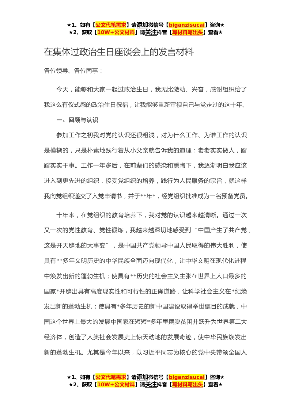 ★1、如有【公文代笔需求】请添加微信号【biganzisucai】咨询★★2、获取【10W+公文材料】请关注抖音【写材料写出头】查看★在集体过政治生日座谈会上的发言材料各位领导、各位同事:今天,能够和大家一起过政治生日,我无比激动、兴奋,感谢组织给了我这么有仪式感的政治生日祝福,让我能够重新审视自己与党走过的这十年。一、回顾与认识参加工作之初我对党的认识还很粗浅,对为什么工作、为谁工作的认识是模糊的,只是朴素地践行着从小父亲就告诉我的道理:老老实实做人,踏踏实实干事。工作一年多后,在前辈们的感染和熏陶下,我逐渐明白我应该进入到更先进的组织,接受党组织的培养,践行为人民服务的宗旨,就这样我向党组织递交了入党申请书,并于**年*,经党组织批准成为一名预备党员。十年来,在党组织的教...