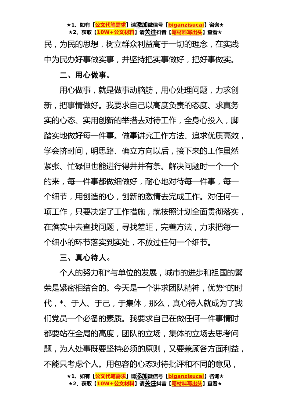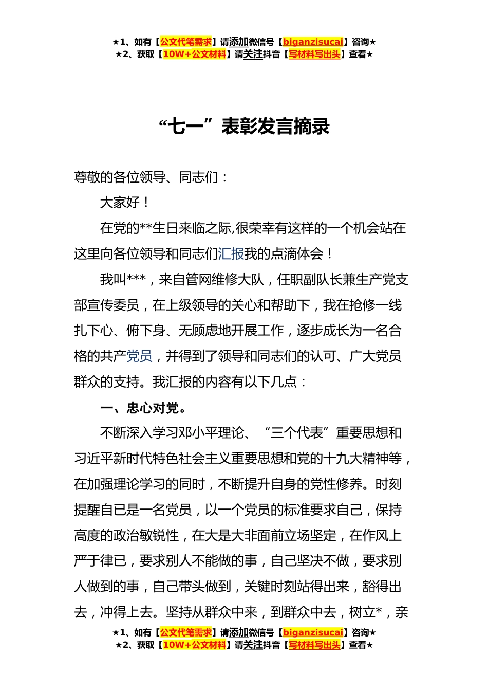 ★1、如有【公文代笔需求】请添加微信号【biganzisucai】咨询★★2、获取【10W+公文材料】请关注抖音【写材料写出头】查看★“七一”表彰发言摘录尊敬的各位领导、同志们:大家好!在党的**生日来临之际,很荣幸有这样的一个机会站在这里向各位领导和同志们汇报我的点滴体会!我叫***,来自管网维修大队,任职副队长兼生产党支部宣传委员,在上级领导的关心和帮助下,我在抢修一线扎下心、俯下身、无顾虑地开展工作,逐步成长为一名合格的共产党员,并得到了领导和同志们的认可、广大党员群众的支持。我汇报的内容有以下几点:一、忠心对党。不断深入学习邓小平理论、“三个代表”重要思想和习近平新时代特色社会主义重要思想和党的十九大精神等,在加强理论学习的同时,不断提升自身的党性修养。时刻提醒自已是一...