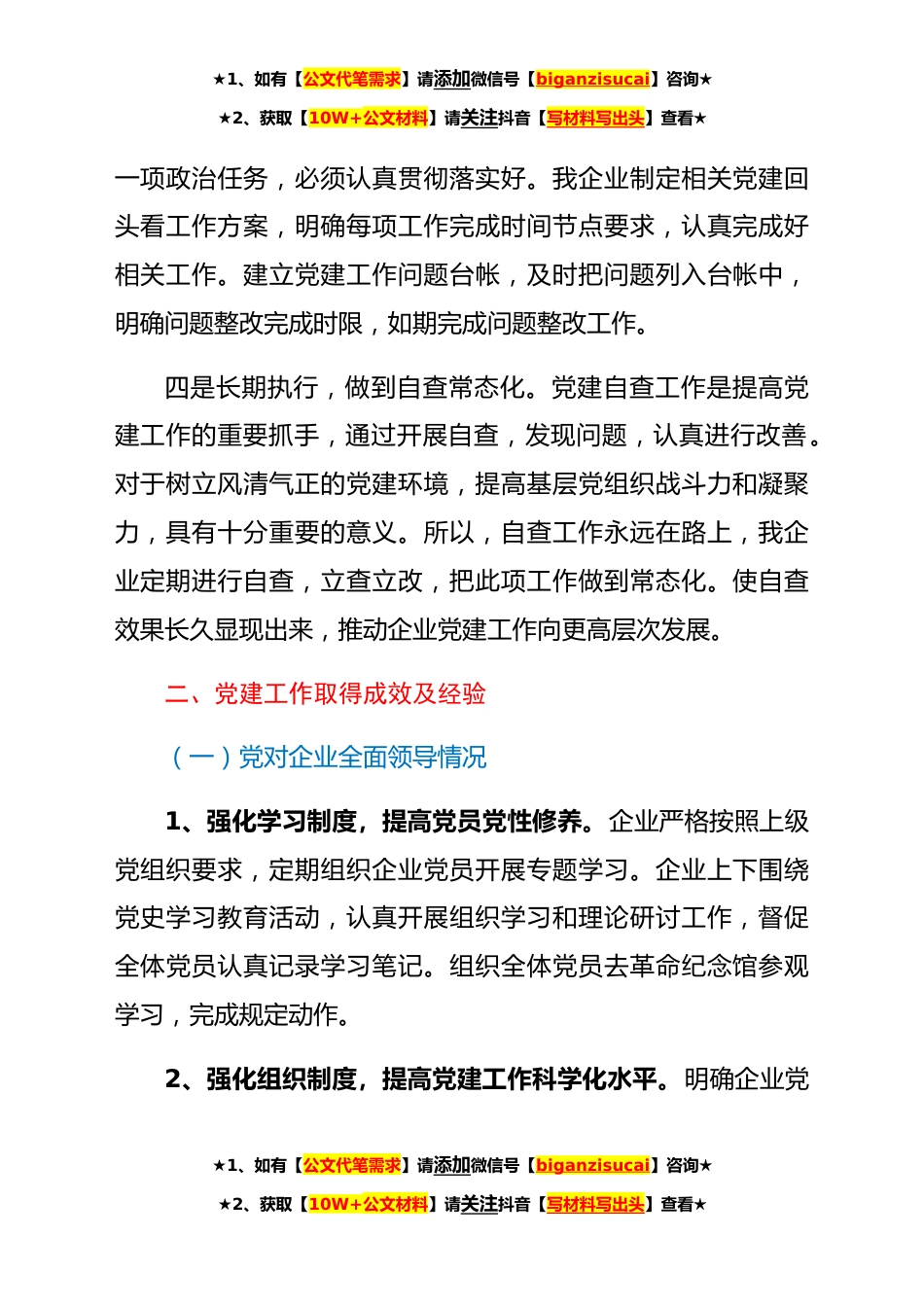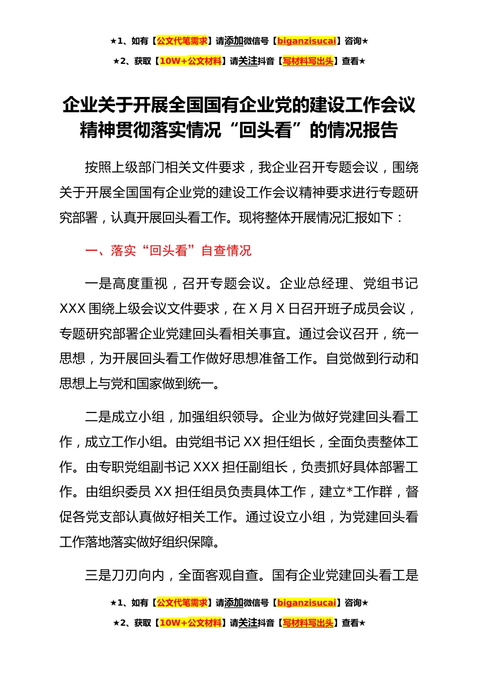 ★1、如有【公文代笔需求】请添加微信号【biganzisucai】咨询★★2、获取【10W+公文材料】请关注抖音【写材料写出头】查看★企业关于开展全国国有企业党的建设工作会议精神贯彻落实情况“回头看”的情况报告按照上级部门相关文件要求,我企业召开专题会议,围绕关于开展全国国有企业党的建设工作会议精神要求进行专题研究部署,认真开展回头看工作。现将整体开展情况汇报如下:一、落实“回头看”自查情况一是高度重视,召开专题会议。企业总经理、党组书记XXX围绕上级会议文件要求,在X月X日召开班子成员会议,专题研究部署企业党建回头看相关事宜。通过会议召开,统一思想,为开展回头看工作做好思想准备工作。自觉做到行动和思想上与党和国家做到统一。二是成立小组,加强组织领导。企业为做好党建回头看工作,...