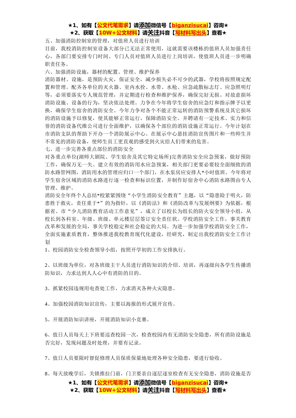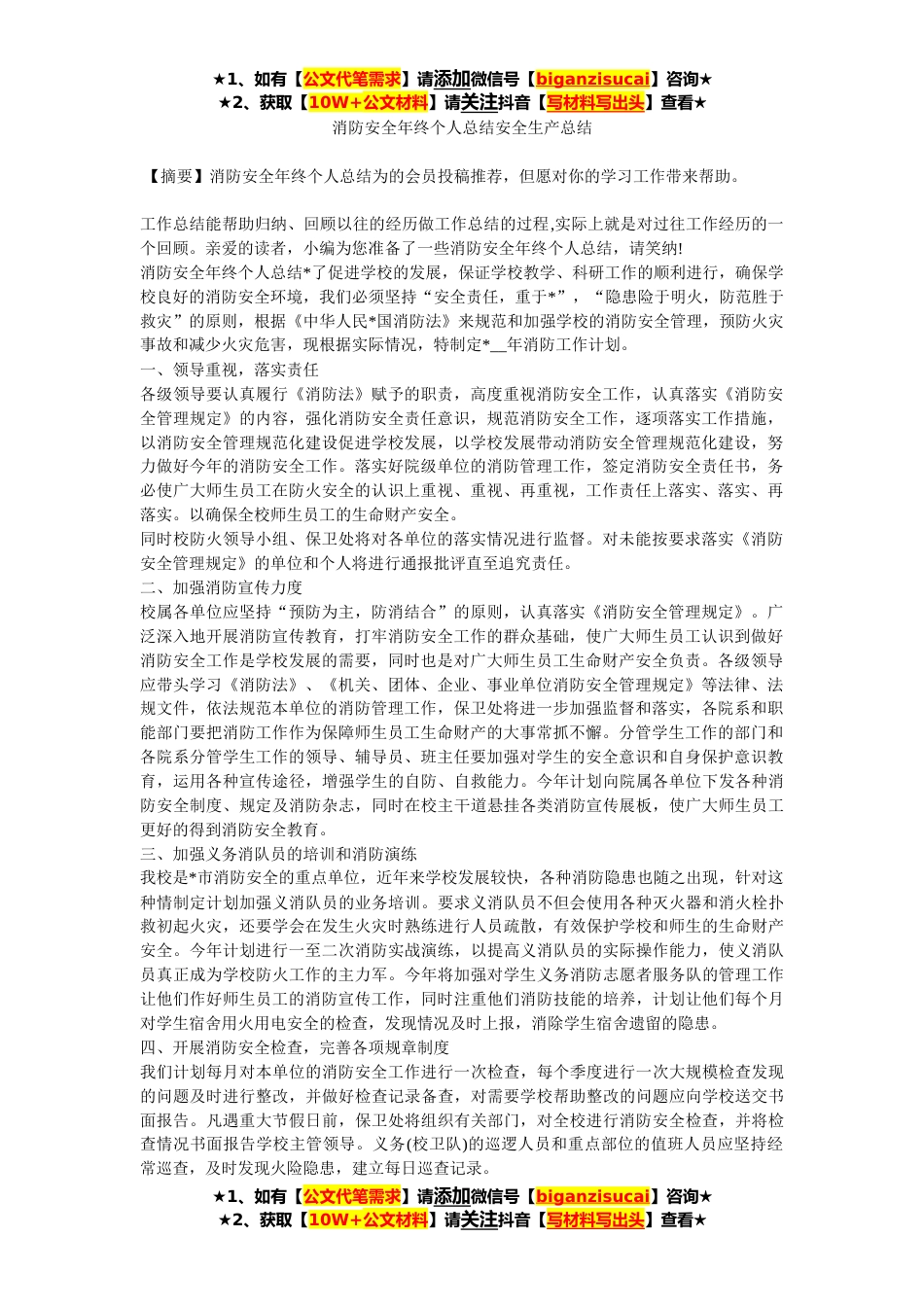 ★1、如有【公文代笔需求】请添加微信号【biganzisucai】咨询★★2、获取【10W+公文材料】请关注抖音【写材料写出头】查看★消防安全年终个人总结安全生产总结【摘要】消防安全年终个人总结为的会员投稿推荐,但愿对你的学习工作带来帮助。工作总结能帮助归纳、回顾以往的经历做工作总结的过程,实际上就是对过往工作经历的一个回顾。亲爱的读者,小编为您准备了一些消防安全年终个人总结,请笑纳!消防安全年终个人总结*了促进学校的发展,保证学校教学、科研工作的顺利进行,确保学校良好的消防安全环境,我们必须坚持“安全责任,重于*”,“隐患险于明火,防范胜于救灾”的原则,根据《中华人民*国消防法》来规范和加强学校的消防安全管理,预防火灾事故和减少火灾危害,现根据实际情况,特制定*__年消防工作计...