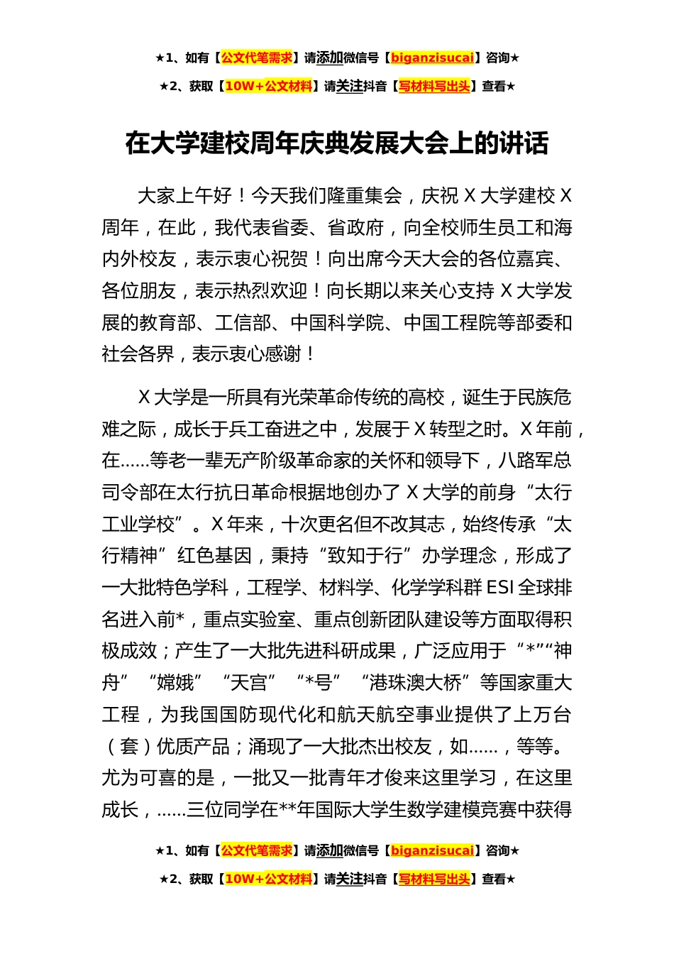 ★1、如有【公文代笔需求】请添加微信号【biganzisucai】咨询★★2、获取【10W+公文材料】请关注抖音【写材料写出头】查看★在大学建校周年庆典发展大会上的讲话大家上午好!今天我们隆重集会,庆祝X大学建校X周年,在此,我代表省委、省政府,向全校师生员工和海内外校友,表示衷心祝贺!向出席今天大会的各位嘉宾、各位朋友,表示热烈欢迎!向长期以来关心支持X大学发展的教育部、工信部、中国科学院、中国工程院等部委和社会各界,表示衷心感谢!X大学是一所具有光荣革命传统的高校,诞生于民族危难之际,成长于兵工奋进之中,发展于X转型之时。X年前,在……等老一辈无产阶级革命家的关怀和领导下,八路军总司令部在太行抗日革命根据地创办了X大学的前身“太行工业学校”。X年来,十次更名但不改其志,始终传...