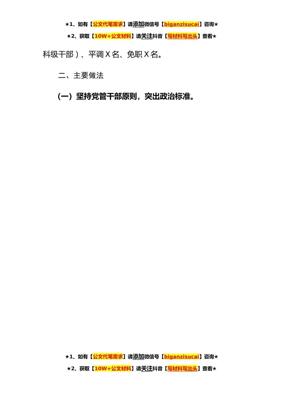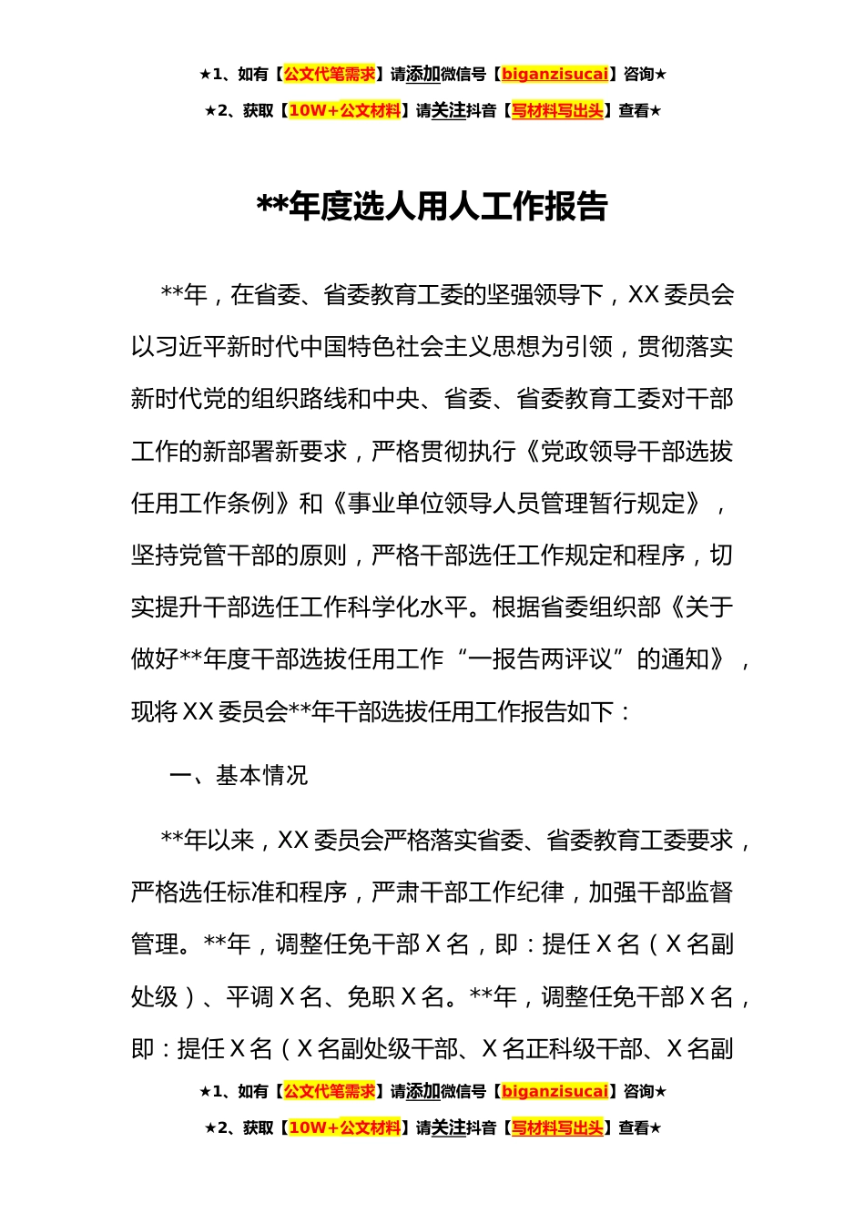 ★1、如有【公文代笔需求】请添加微信号【biganzisucai】咨询★★2、获取【10W+公文材料】请关注抖音【写材料写出头】查看★**年度选人用人工作报告**年,在省委、省委教育工委的坚强领导下,XX委员会以习近平新时代中国特色社会主义思想为引领,贯彻落实新时代党的组织路线和中央、省委、省委教育工委对干部工作的新部署新要求,严格贯彻执行《党政领导干部选拔任用工作条例》和《事业单位领导人员管理暂行规定》,坚持党管干部的原则,严格干部选任工作规定和程序,切实提升干部选任工作科学化水平。根据省委组织部《关于做好**年度干部选拔任用工作“一报告两评议”的通知》,现将XX委员会**年干部选拔任用工作报告如下:一、基本情况**年以来,XX委员会严格落实省委、省委教育工委要求,严格选任标准和程序,...
