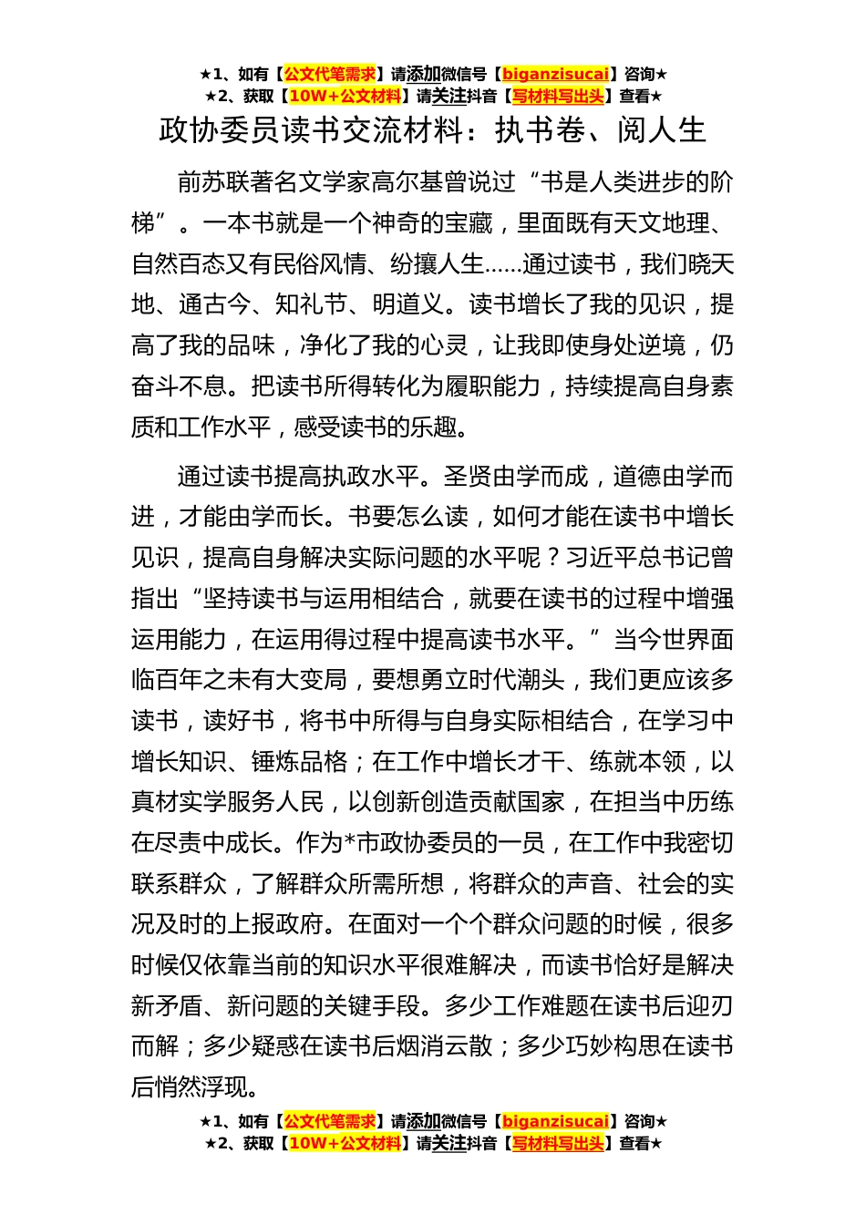 ★1、如有【公文代笔需求】请添加微信号【biganzisucai】咨询★★2、获取【10W+公文材料】请关注抖音【写材料写出头】查看★政协委员读书交流材料:执书卷、阅人生前苏联著名文学家高尔基曾说过“书是人类进步的阶梯”。一本书就是一个神奇的宝藏,里面既有天文地理、自然百态又有民俗风情、纷攘人生……通过读书,我们晓天地、通古今、知礼节、明道义。读书增长了我的见识,提高了我的品味,净化了我的心灵,让我即使身处逆境,仍奋斗不息。把读书所得转化为履职能力,持续提高自身素质和工作水平,感受读书的乐趣。通过读书提高执政水平。圣贤由学而成,道德由学而进,才能由学而长。书要怎么读,如何才能在读书中增长见识,提高自身解决实际问题的水平呢?习近平总书记曾指出“坚持读书与运用相结合,就要在读...