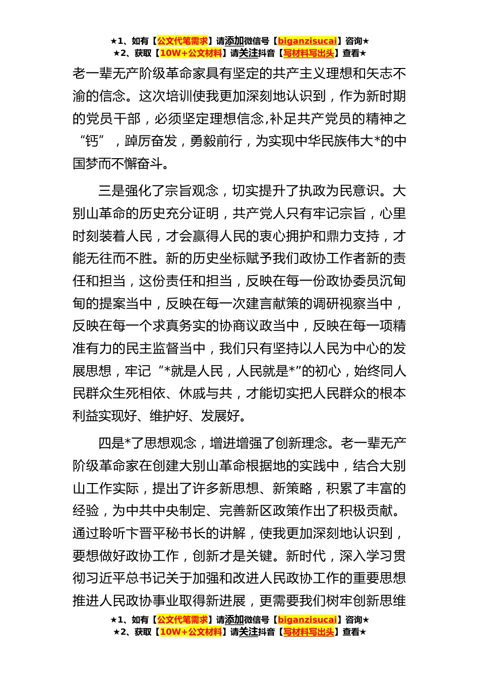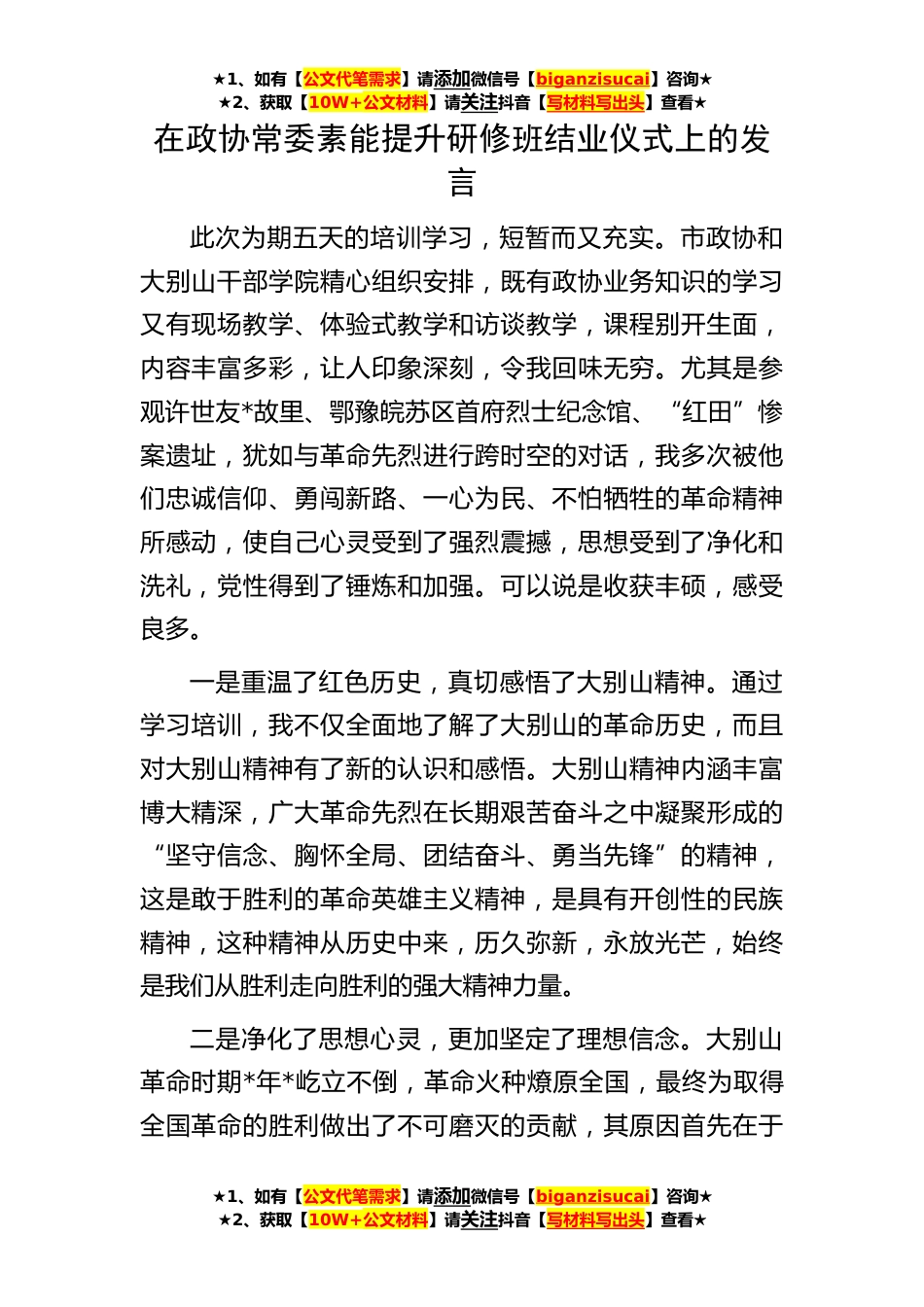 ★1、如有【公文代笔需求】请添加微信号【biganzisucai】咨询★★2、获取【10W+公文材料】请关注抖音【写材料写出头】查看★在政协常委素能提升研修班结业仪式上的发言此次为期五天的培训学习,短暂而又充实。市政协和大别山干部学院精心组织安排,既有政协业务知识的学习又有现场教学、体验式教学和访谈教学,课程别开生面,内容丰富多彩,让人印象深刻,令我回味无穷。尤其是参观许世友*故里、鄂豫皖苏区首府烈士纪念馆、“红田”惨案遗址,犹如与革命先烈进行跨时空的对话,我多次被他们忠诚信仰、勇闯新路、一心为民、不怕牺牲的革命精神所感动,使自己心灵受到了强烈震撼,思想受到了净化和洗礼,党性得到了锤炼和加强。可以说是收获丰硕,感受良多。一是重温了红色历史,真切感悟了大别山精神。通过学习培训...