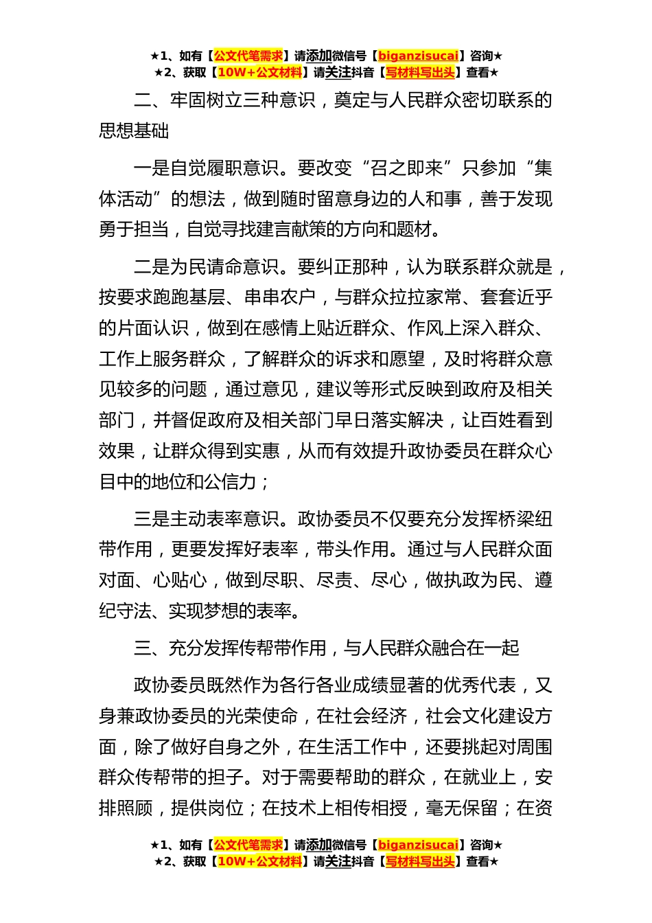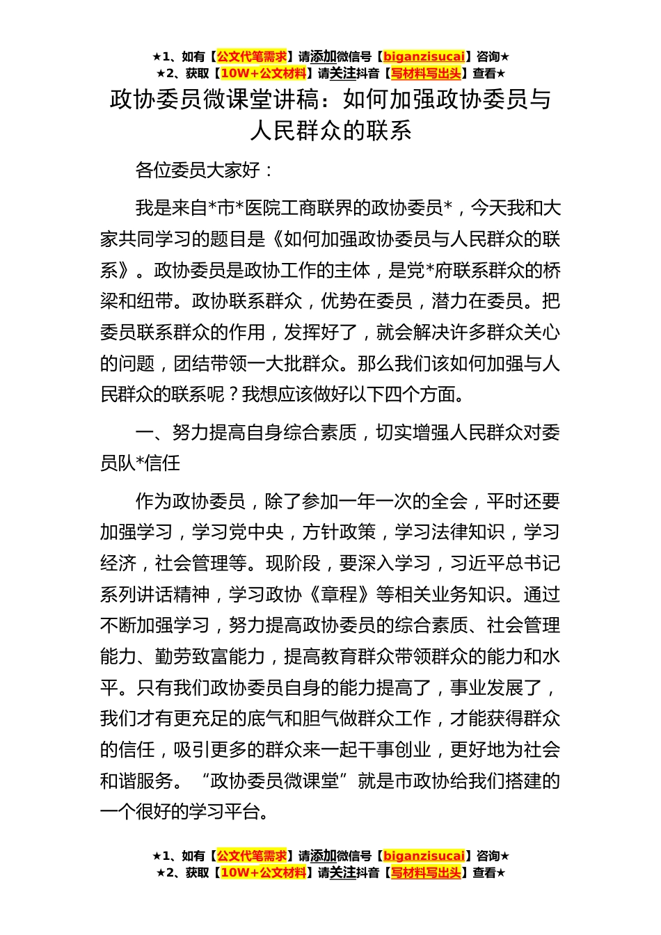 ★1、如有【公文代笔需求】请添加微信号【biganzisucai】咨询★★2、获取【10W+公文材料】请关注抖音【写材料写出头】查看★政协委员微课堂讲稿:如何加强政协委员与人民群众的联系各位委员大家好:我是来自*市*医院工商联界的政协委员*,今天我和大家共同学习的题目是《如何加强政协委员与人民群众的联系》。政协委员是政协工作的主体,是党*府联系群众的桥梁和纽带。政协联系群众,优势在委员,潜力在委员。把委员联系群众的作用,发挥好了,就会解决许多群众关心的问题,团结带领一大批群众。那么我们该如何加强与人民群众的联系呢?我想应该做好以下四个方面。一、努力提高自身综合素质,切实增强人民群众对委员队*信任作为政协委员,除了参加一年一次的全会,平时还要加强学习,学习党中央,方针政策,学习法...