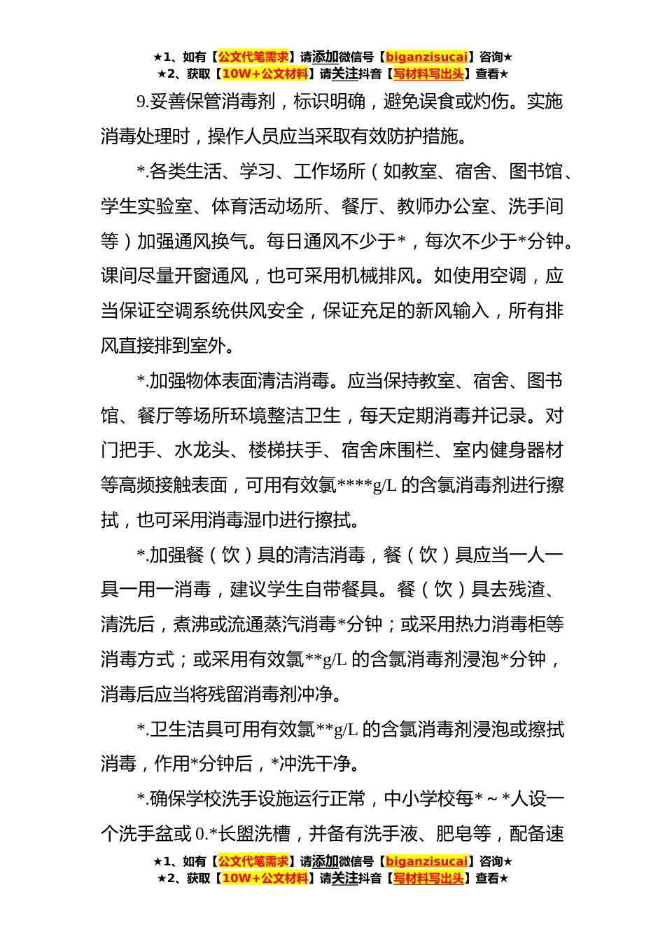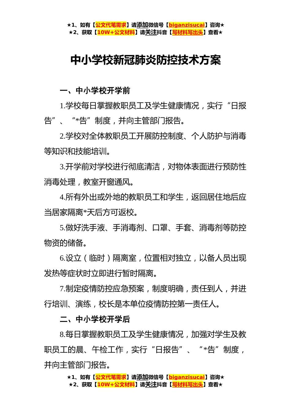 ★1、如有【公文代笔需求】请添加微信号【biganzisucai】咨询★★2、获取【10W+公文材料】请关注抖音【写材料写出头】查看★中小学校新冠肺炎防控技术方案一、中小学校开学前1.学校每日掌握教职员工及学生健康情况,实行“日报告”、“*告”制度,并向主管部门报告。2.学校对全体教职员工开展防控制度、个人防护与消毒等知识和技能培训。3.开学前对学校进行彻底清洁,对物体表面进行预防性消毒处理,教室开窗通风。4.所有外出或外地的教职员工和学生,返回居住地后应当居家隔离*天后方可返校。5.做好洗手液、手消毒剂、口罩、手套、消毒剂等防控物资的储备。6.设立(临时)隔离室,位置相对独立,以备人员出现发热等症状时立即进行暂时隔离。7.制定疫情防控应急预案,制度明确,责任到人,并进行培训、演练,校长...