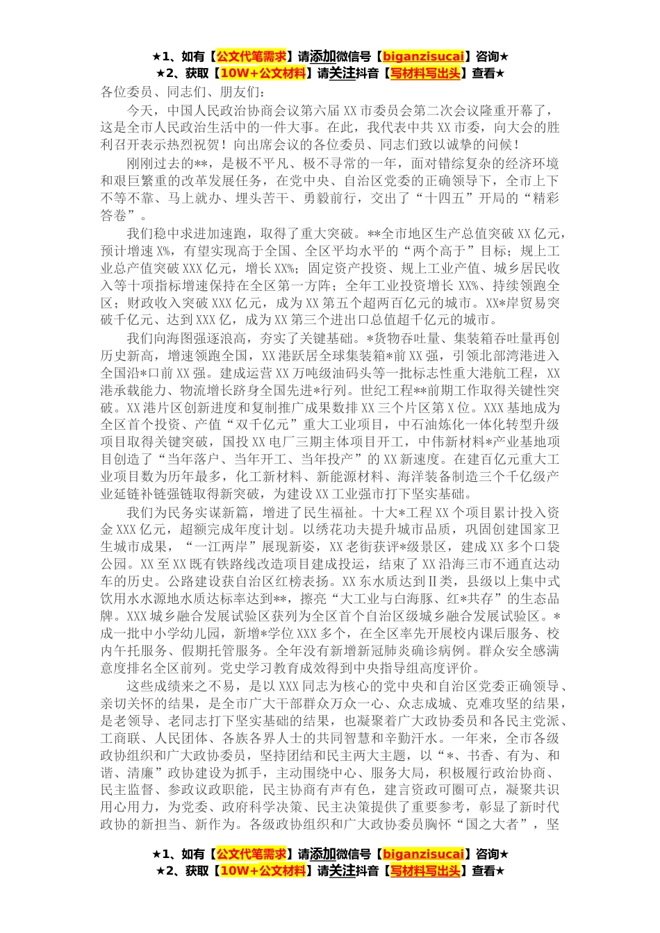 ★1、如有【公文代笔需求】请添加微信号【biganzisucai】咨询★★2、获取【10W+公文材料】请关注抖音【写材料写出头】查看★各位委员、同志们、朋友们:今天,中国人民政治协商会议第六届XX市委员会第二次会议隆重开幕了,这是全市人民政治生活中的一件大事。在此,我代表中共XX市委,向大会的胜利召开表示热烈祝贺!向出席会议的各位委员、同志们致以诚挚的问候!刚刚过去的**,是极不平凡、极不寻常的一年,面对错综复杂的经济环境和艰巨繁重的改革发展任务,在党中央、自治区党委的正确领导下,全市上下不等不靠、马上就办、埋头苦干、勇毅前行,交出了“十四五”开局的“精彩答卷”。我们稳中求进加速跑,取得了重大突破。**全市地区生产总值突破XX亿元,预计增速X%,有望实现高于全国、全区平均水平的“两个...