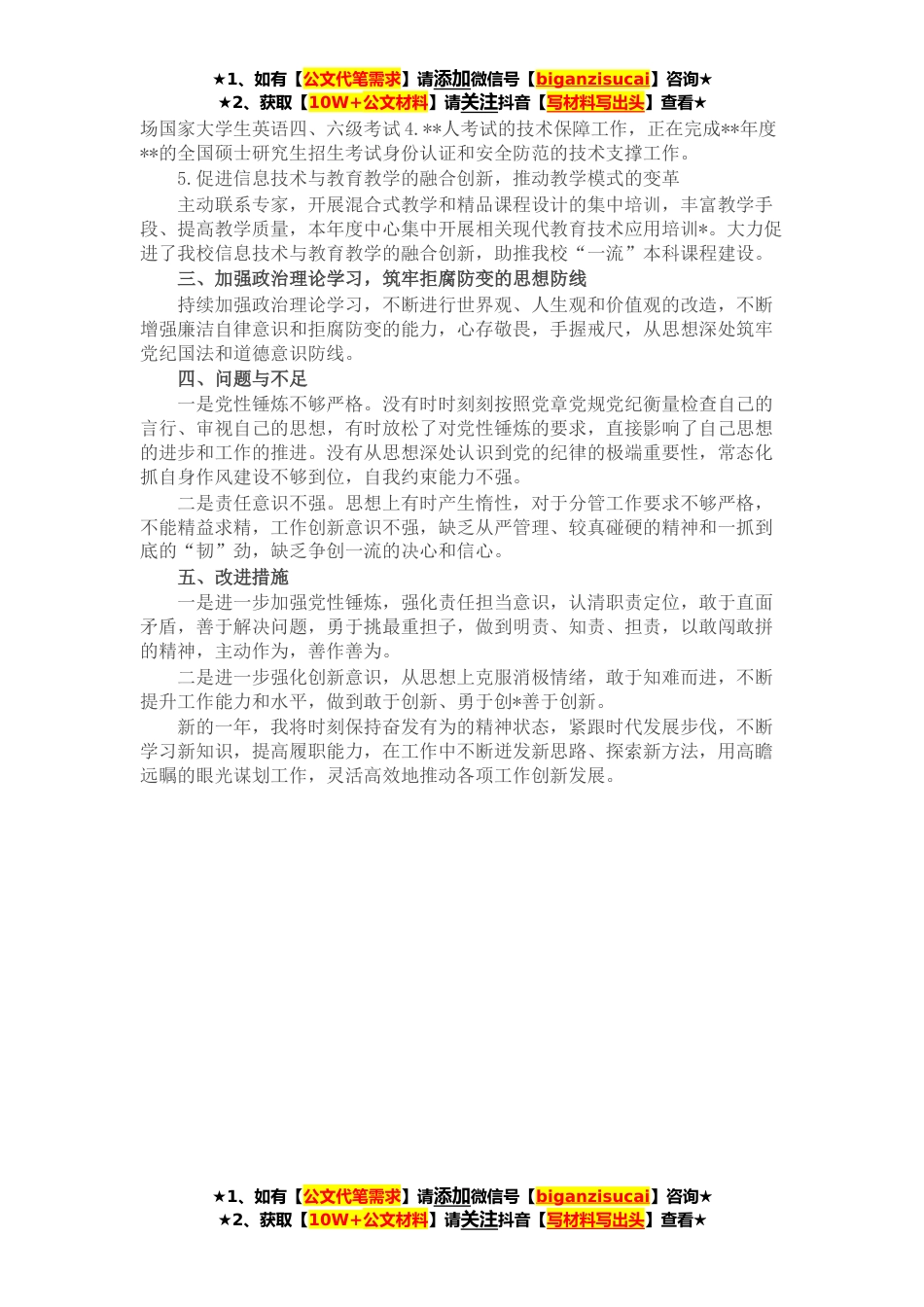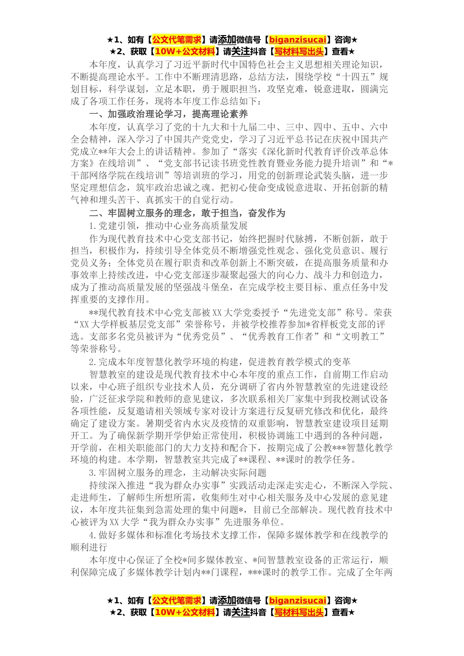 ★1、如有【公文代笔需求】请添加微信号【biganzisucai】咨询★★2、获取【10W+公文材料】请关注抖音【写材料写出头】查看★本年度,认真学习了习近平新时代中国特色社会主义思想相关理论知识,不断提高理论水平。工作中不断理清思路,总结方法,围绕学校“十四五”规划目标,科学谋划,立足本职,勇于履职担当,攻坚克难,锐意进取,圆满完成了各项工作任务,现将本年度工作总结如下:一、加强政治理论学习,提高理论素养本年度,认真学习了党的十九大和十九届二中、三中、四中、五中、六中全会精神,深入学习了中国共产党党史,学习了习近平总书记在庆祝中国共产党成立**年大会上的讲话精神。参加了“落实《深化新时代教育评价改革总体方案》在线培训”、“党支部书记读书班党性教育暨业务能力提升培训”和“*干...