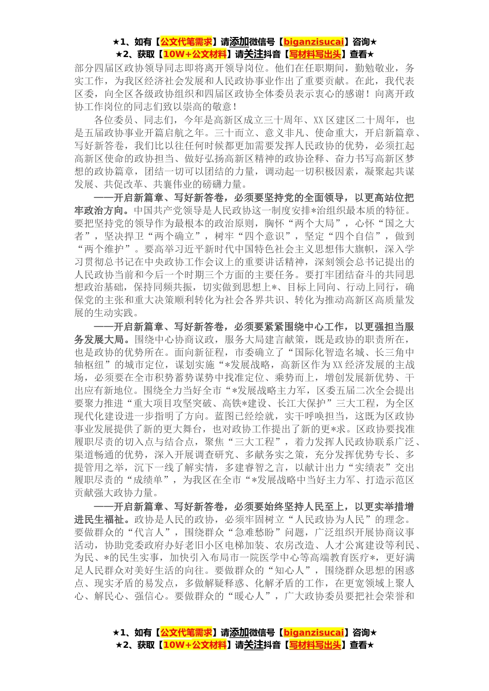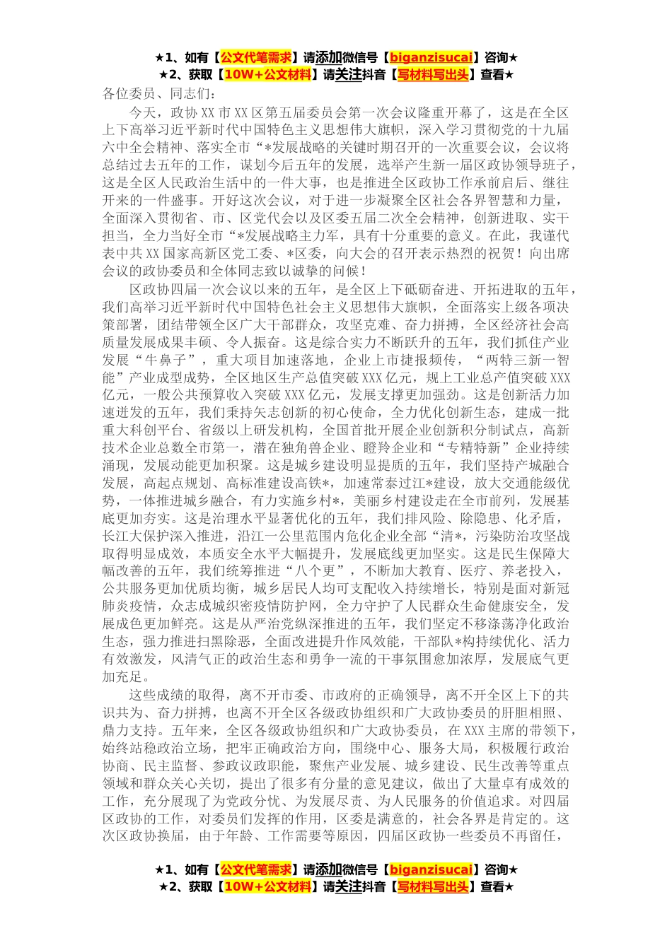 ★1、如有【公文代笔需求】请添加微信号【biganzisucai】咨询★★2、获取【10W+公文材料】请关注抖音【写材料写出头】查看★各位委员、同志们:今天,政协XX市XX区第五届委员会第一次会议隆重开幕了,这是在全区上下高举习近平新时代中国特色主义思想伟大旗帜,深入学习贯彻党的十九届六中全会精神、落实全市“*发展战略的关键时期召开的一次重要会议,会议将总结过去五年的工作,谋划今后五年的发展,选举产生新一届区政协领导班子,这是全区人民政治生活中的一件大事,也是推进全区政协工作承前启后、继往开来的一件盛事。开好这次会议,对于进一步凝聚全区社会各界智慧和力量,全面深入贯彻省、市、区党代会以及区委五届二次全会精神,创新进取、实干担当,全力当好全市“*发展战略主力军,具有十分重要的意义...