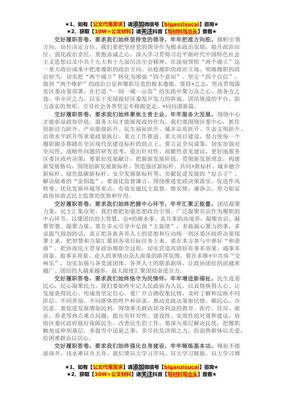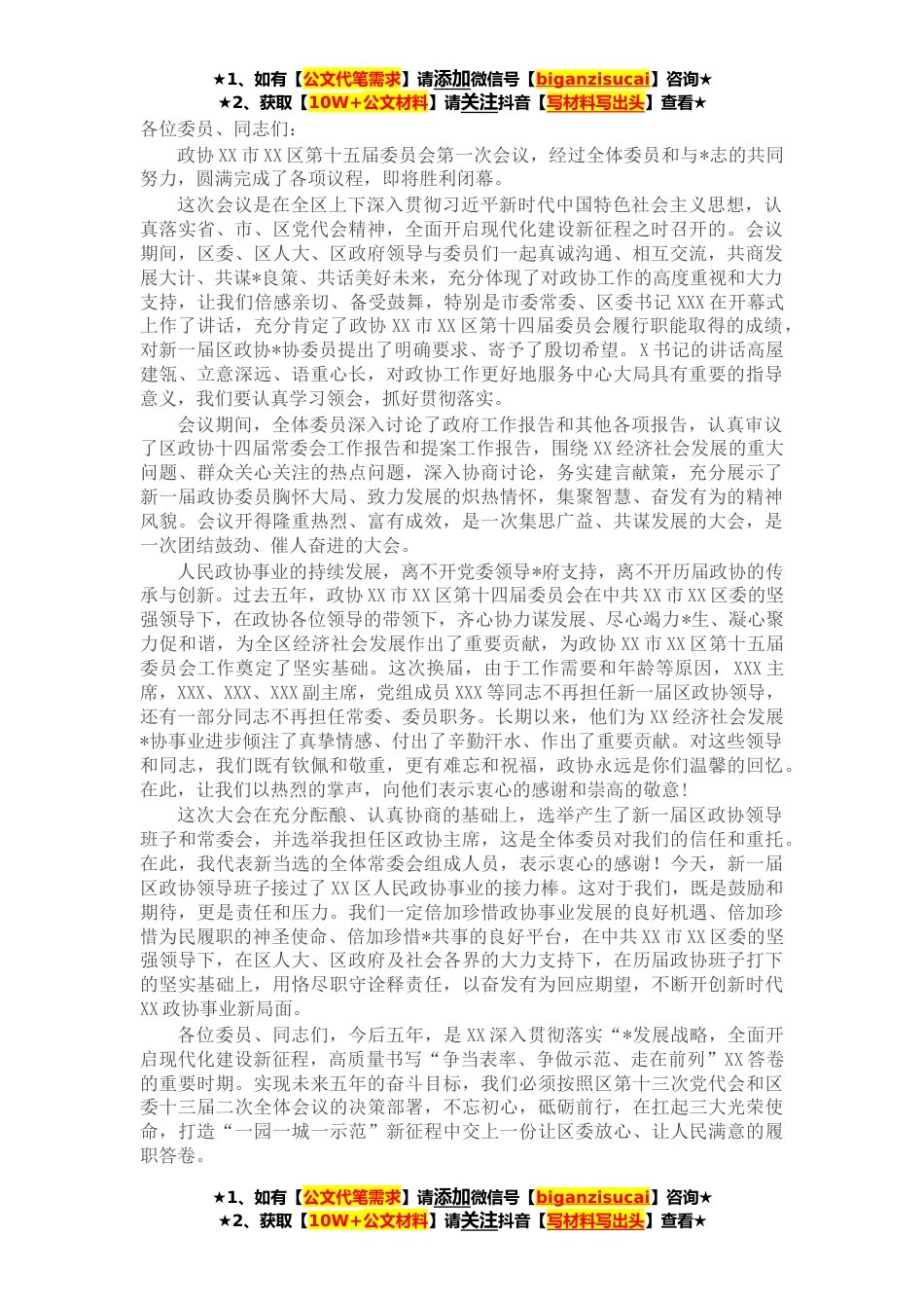 ★1、如有【公文代笔需求】请添加微信号【biganzisucai】咨询★★2、获取【10W+公文材料】请关注抖音【写材料写出头】查看★各位委员、同志们:政协XX市XX区第十五届委员会第一次会议,经过全体委员和与*志的共同努力,圆满完成了各项议程,即将胜利闭幕。这次会议是在全区上下深入贯彻习近平新时代中国特色社会主义思想,认真落实省、市、区党代会精神,全面开启现代化建设新征程之时召开的。会议期间,区委、区人大、区政府领导与委员们一起真诚沟通、相互交流,共商发展大计、共谋*良策、共话美好未来,充分体现了对政协工作的高度重视和大力支持,让我们倍感亲切、备受鼓舞,特别是市委常委、区委书记XXX在开幕式上作了讲话,充分肯定了政协XX市XX区第十四届委员会履行职能取得的成绩,对新一届区政协*协委员...