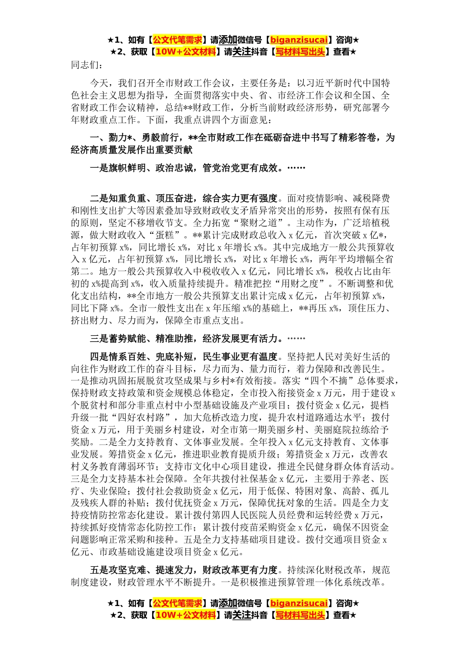 ★1、如有【公文代笔需求】请添加微信号【biganzisucai】咨询★★2、获取【10W+公文材料】请关注抖音【写材料写出头】查看★同志们:今天,我们召开全市财政工作会议,主要任务是:以习近平新时代中国特色社会主义思想为指导,全面贯彻落实中央、省、市经济工作会议和全国、全省财政工作会议精神,总结**财政工作,分析当前财政经济形势,研究部署今年财政重点工作。下面,我重点讲四个方面意见:一、勠力*、勇毅前行,**全市财政工作在砥砺奋进中书写了精彩答卷,为经济高质量发展作出重要贡献一是旗帜鲜明、政治忠诚,管党治党更有成效。……二是知重负重、顶压奋进,综合实力更有强度。面对疫情影响、减税降费和刚性支出扩大等因素叠加导致财政收支矛盾异常突出的形势,按照有保有压的原则,坚定不移增收节支。...