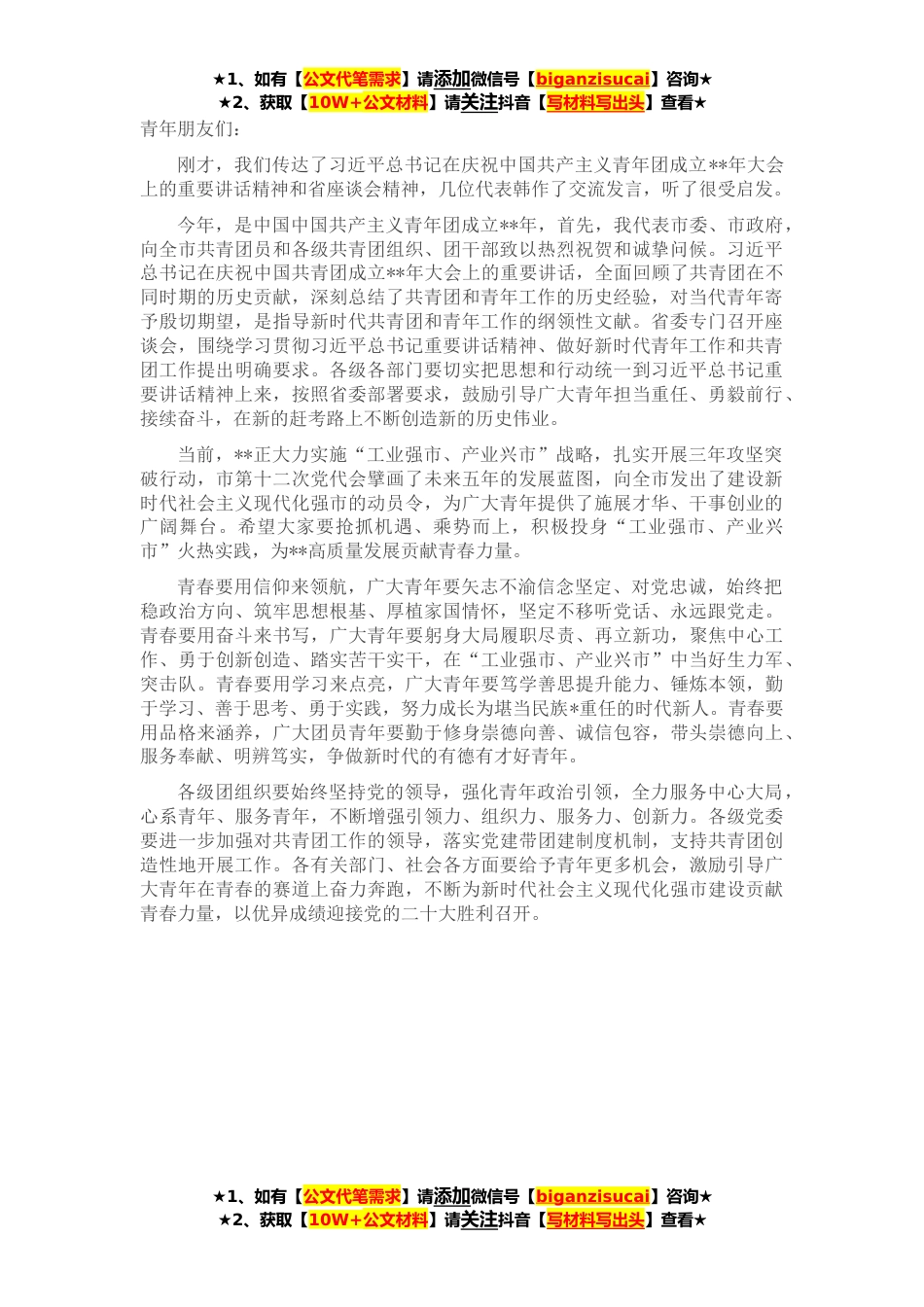 ★1、如有【公文代笔需求】请添加微信号【biganzisucai】咨询★★2、获取【10W+公文材料】请关注抖音【写材料写出头】查看★青年朋友们:刚才,我们传达了习近平总书记在庆祝中国共产主义青年团成立**年大会上的重要讲话精神和省座谈会精神,几位代表韩作了交流发言,听了很受启发。今年,是中国中国共产主义青年团成立**年,首先,我代表市委、市政府,向全市共青团员和各级共青团组织、团干部致以热烈祝贺和诚挚问候。习近平总书记在庆祝中国共青团成立**年大会上的重要讲话,全面回顾了共青团在不同时期的历史贡献,深刻总结了共青团和青年工作的历史经验,对当代青年寄予殷切期望,是指导新时代共青团和青年工作的纲领性文献。省委专门召开座谈会,围绕学习贯彻习近平总书记重要讲话精神、做好新时代青年工作...