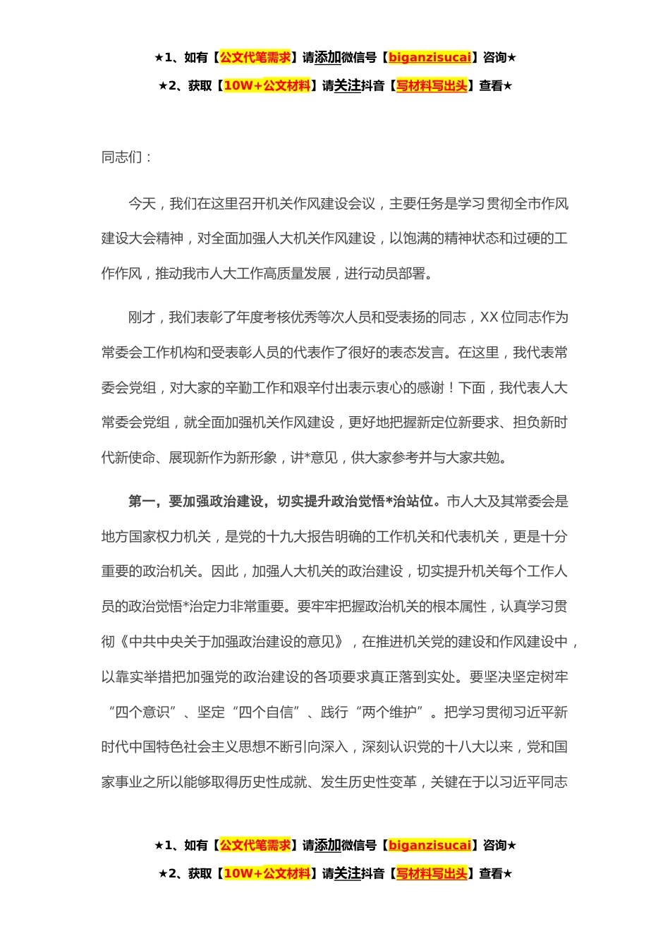 ★1、如有【公文代笔需求】请添加微信号【biganzisucai】咨询★★2、获取【10W+公文材料】请关注抖音【写材料写出头】查看★同志们:今天,我们在这里召开机关作风建设会议,主要任务是学习贯彻全市作风建设大会精神,对全面加强人大机关作风建设,以饱满的精神状态和过硬的工作作风,推动我市人大工作高质量发展,进行动员部署。刚才,我们表彰了年度考核优秀等次人员和受表扬的同志,XX位同志作为常委会工作机构和受表彰人员的代表作了很好的表态发言。在这里,我代表常委会党组,对大家的辛勤工作和艰辛付出表示衷心的感谢!下面,我代表人大常委会党组,就全面加强机关作风建设,更好地把握新定位新要求、担负新时代新使命、展现新作为新形象,讲*意见,供大家参考并与大家共勉。第一,要加强政治建设,切实提...