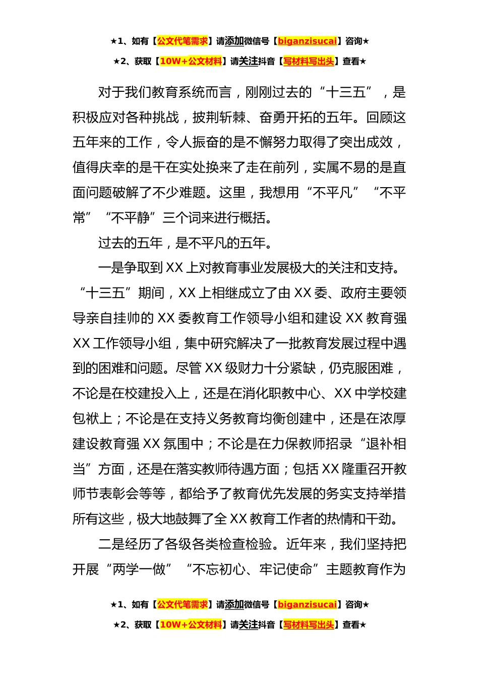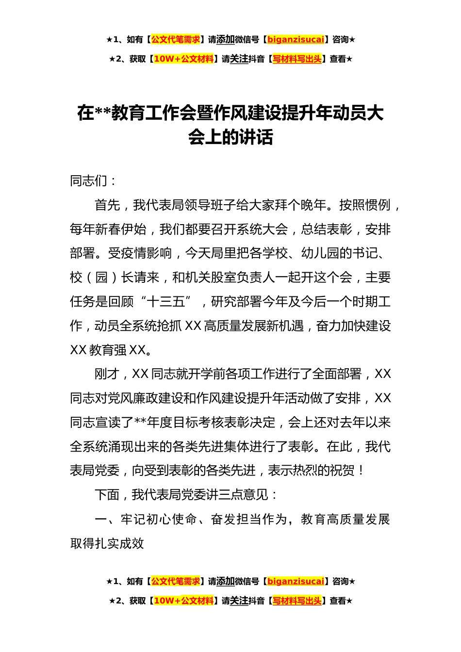★1、如有【公文代笔需求】请添加微信号【biganzisucai】咨询★★2、获取【10W+公文材料】请关注抖音【写材料写出头】查看★在**教育工作会暨作风建设提升年动员大会上的讲话同志们:首先,我代表局领导班子给大家拜个晚年。按照惯例,每年新春伊始,我们都要召开系统大会,总结表彰,安排部署。受疫情影响,今天局里把各学校、幼儿园的书记、校(园)长请来,和机关股室负责人一起开这个会,主要任务是回顾“十三五”,研究部署今年及今后一个时期工作,动员全系统抢抓XX高质量发展新机遇,奋力加快建设XX教育强XX。刚才,XX同志就开学前各项工作进行了全面部署,XX同志对党风廉政建设和作风建设提升年活动做了安排,XX同志宣读了**年度目标考核表彰决定,会上还对去年以来全系统涌现出来的各类先进集体进行了表...