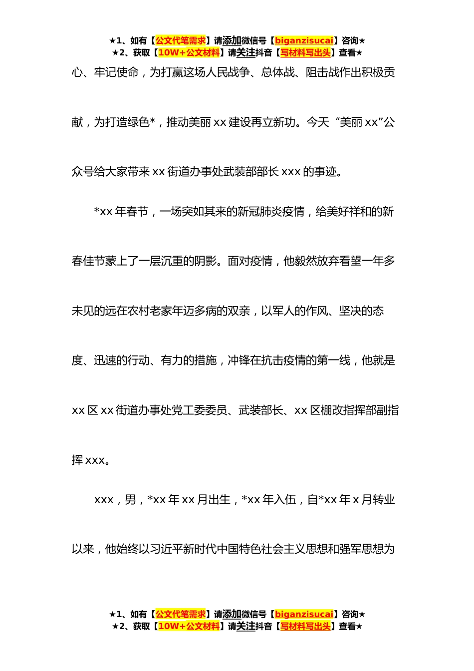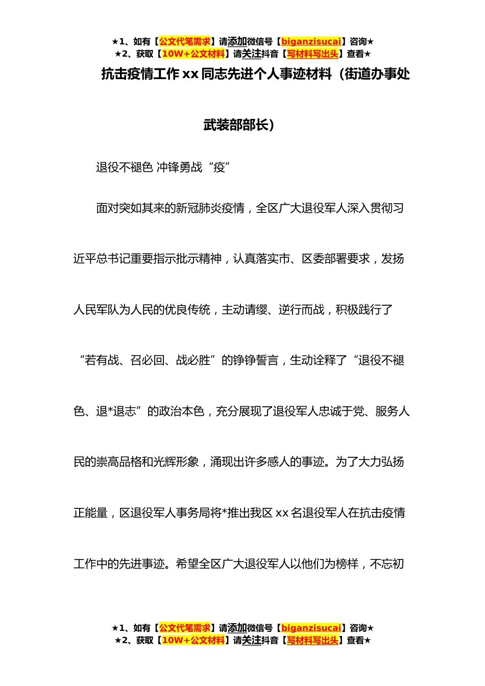 ★1、如有【公文代笔需求】请添加微信号【biganzisucai】咨询★★2、获取【10W+公文材料】请关注抖音【写材料写出头】查看★抗击疫情工作xx同志先进个人事迹材料(街道办事处武装部部长)退役不褪色冲锋勇战“疫”面对突如其来的新冠肺炎疫情,全区广大退役军人深入贯彻习近平总书记重要指示批示精神,认真落实市、区委部署要求,发扬人民军队为人民的优良传统,主动请缨、逆行而战,积极践行了“若有战、召必回、战必胜”的铮铮誓言,生动诠释了“退役不褪色、退*退志”的政治本色,充分展现了退役军人忠诚于党、服务人民的崇高品格和光辉形象,涌现出许多感人的事迹。为了大力弘扬正能量,区退役军人事务局将*推出我区xx名退役军人在抗击疫情工作中的先进事迹。希望全区广大退役军人以他们为榜样,不忘初★1、如...