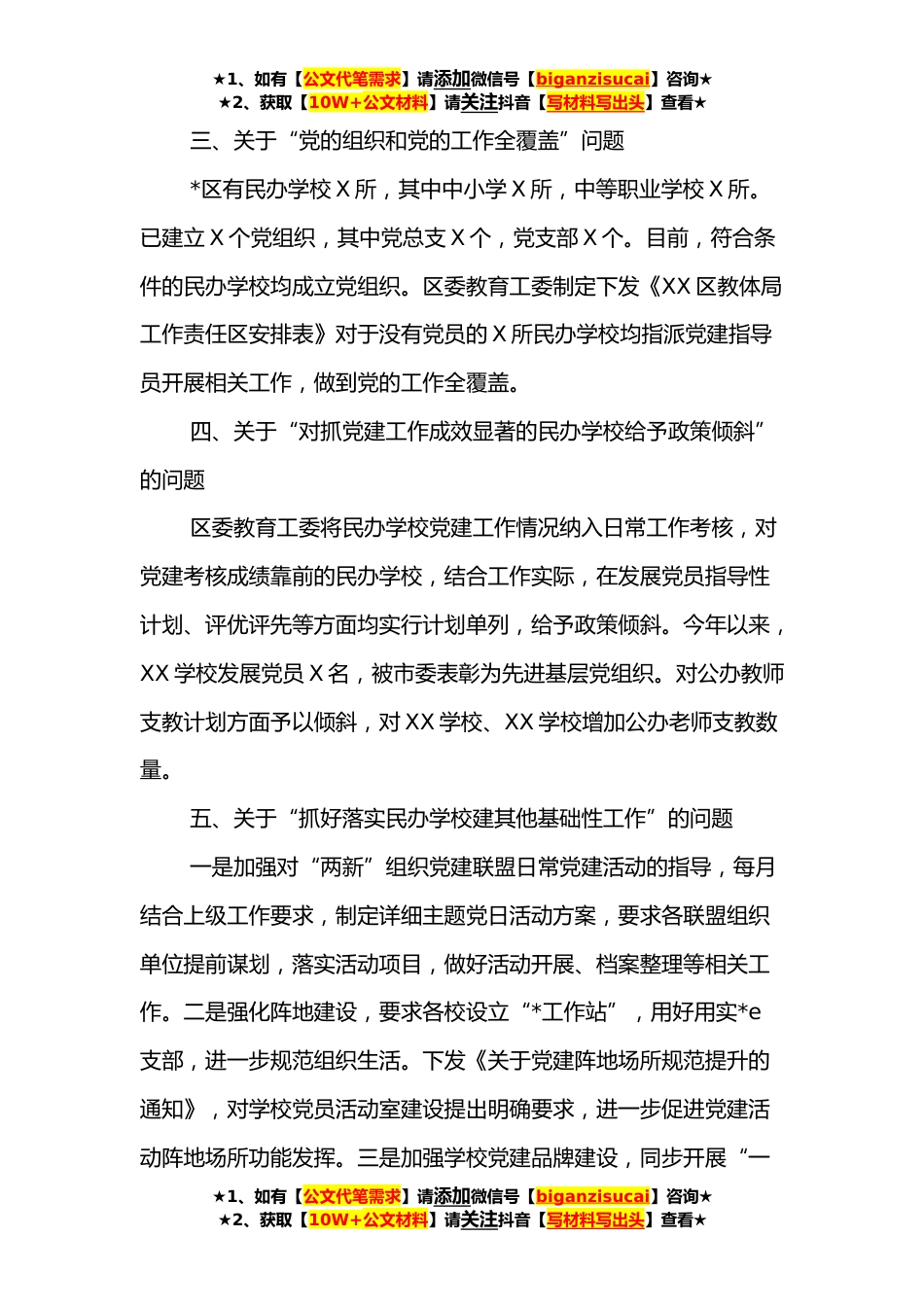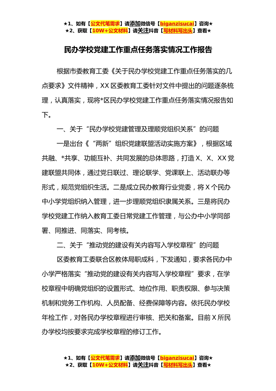 ★1、如有【公文代笔需求】请添加微信号【biganzisucai】咨询★★2、获取【10W+公文材料】请关注抖音【写材料写出头】查看★民办学校党建工作重点任务落实情况工作报告根据市委教育工委《关于民办学校党建工作重点任务落实的几点要求》文件精神,XX区委教育工委针对文件中提出的问题逐条梳理,认真落实,现将*区民办学校党建工作重点任务落实情况报告如下。一、关于“民办学校党建管理及理顺党组织关系”的问题一是出台《“两新”组织党建联盟活动实施方案》,根据区域共融、*共享、功能互补、共同发展的总体思路,打造X、X、XX党建联盟共同体,通过党日联过、理论联学、党课联上、活动联办等形式,规范党组织生活。二是成立民办教育行业党委,将X个民办中小学党组织纳入管理,进一步理顺党组织隶属关系。三是将民...