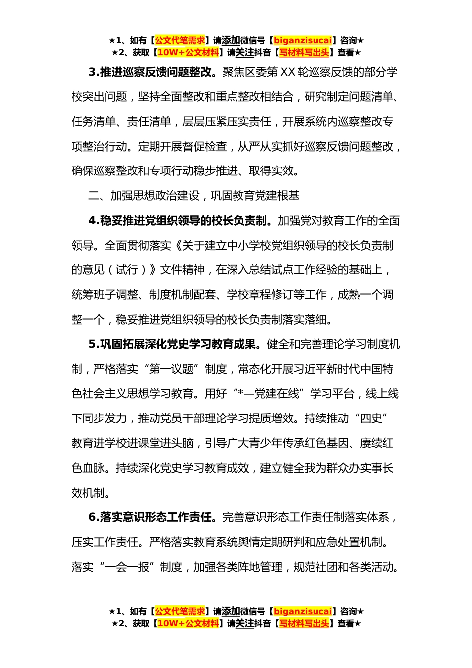 ★1、如有【公文代笔需求】请添加微信号【biganzisucai】咨询★★2、获取【10W+公文材料】请关注抖音【写材料写出头】查看★教育系统**年党建工作计划**年全区教体系统党建工作的总体思路是:以习近平新时代中国特色社会主义思想为指导,全面贯彻落实党的十九大和十九届历次全会精神,深入贯彻落实习近平总书记关于加强教育工作的重要讲话精神,按照上级部署要求,持续推动全区教体系统党建工作高质量发展,推进教育治理体系和治理能力现代化,为奋力谱写新时代XX教育高质量发展新篇章、办好人民满意的教育奠定更加坚实的基础。一、推进全面从严治党,筑牢廉政思想堡垒1.抓实抓优作风建设。严格执行党员双报到双报告制度,助力共驻共建社区做好疫情防控工作。严格落实中央八项规定及其实施细则精神,坚定不移纠“...