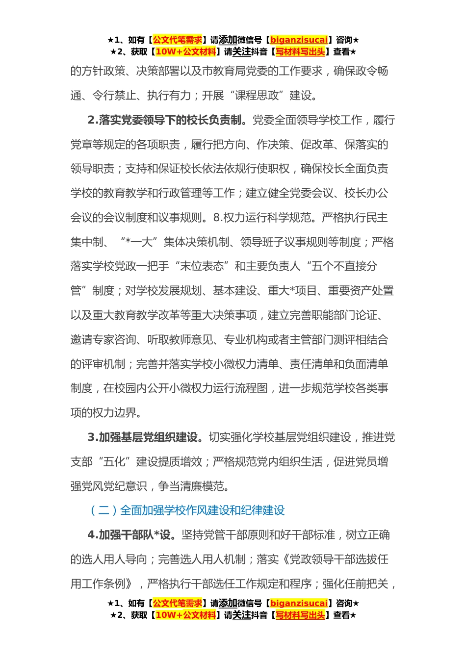 ★1、如有【公文代笔需求】请添加微信号【biganzisucai】咨询★★2、获取【10W+公文材料】请关注抖音【写材料写出头】查看★关于推进清廉学校建设的实施方案为深入贯彻习近平总书记在中央纪委全会上系列重要讲话、对*工作的重要指示精神,认真落实中国共产党*省第十二次代表大会和中国共产党长*第十四次代表大会精神,根据《关于推进全省清廉学校建设的实施意见》(湘教工委发〔**〕*)和《关于推进全市清廉学校建设的实施意见》(长教党〔***号)部署要求,结合我校实际,现就推进清廉学校建设提出如下实施方案。一、总体要求坚持以习近平新时代中国特色社会主义思想为指导,牢固树立“四个意识”,坚定“四个自信”,做到“两个维护”,推进全面从严治党向基层延伸,将清廉学校建设融入学校教育改革发展全过程,...