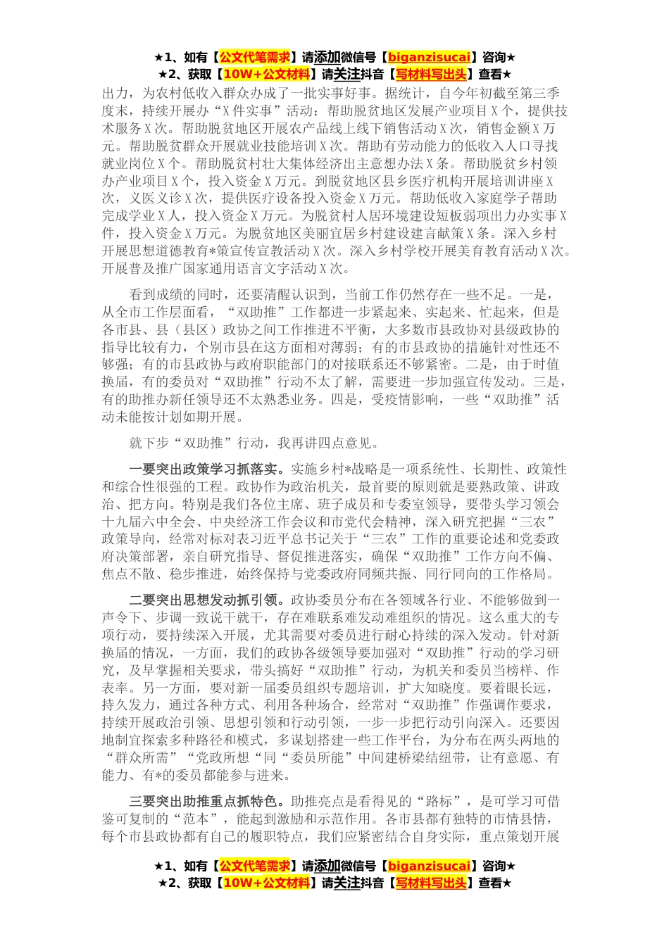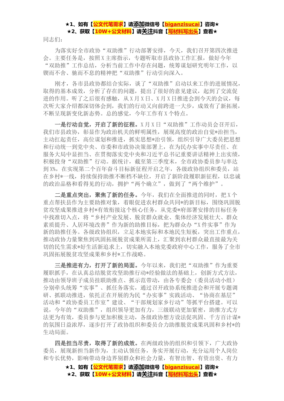 ★1、如有【公文代笔需求】请添加微信号【biganzisucai】咨询★★2、获取【10W+公文材料】请关注抖音【写材料写出头】查看★同志们:为落实好全市政协“双助推”行动部署安排,今天,我们召开第四次推进会。主要任务是,按照X主席指示,专题听取市县政协工作汇报,做好今年“双助推”工作总结,分析当前工作中存在问题,统筹谋划研究明年工作,以锲而不舍、驰而不息的精神把“双助推”行动引向深入。刚才,各市县政协都结合实际,谈了“双助推”启动以来工作的进展情况,取得的基本成效,分析了存在的问题,提出了很好的意见建议,起到了交流促进的作用。听了之后很有感触,从X月X日、X月X日推进会到今天的会议,每次听大家介绍都深切体会到,我们的行动又向前跨进一大步,成效有了新拓展,不断呈现新变化新态势。...