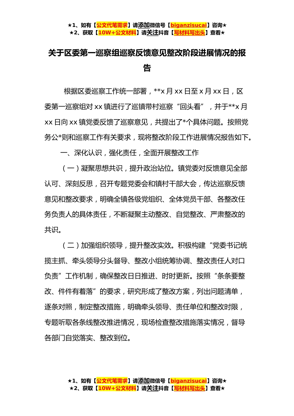 ★1、如有【公文代笔需求】请添加微信号【biganzisucai】咨询★★2、获取【10W+公文材料】请关注抖音【写材料写出头】查看★关于区委第一巡察组巡察反馈意见整改阶段进展情况的报告根据区委巡察工作统一部署,**x月xx日至x月xx日,区委第一巡察组对xx镇进行了巡镇带村巡察“回头看”,并于**x月xx日向xx镇党委反馈了巡察意见,共提出了*个具体问题。按照党务公*则和巡察工作有关要求,现将整改阶段工作进展情况报告如下。一、深化认识,强化责任,全面开展整改工作(一)凝聚思想共识,提升政治站位。镇党委对反馈意见全部认可、深刻反思,召开专题党委会和镇村干部大会,传达巡察反馈意见和整改要求,明确全镇各级党组织、全体党员干部、各整改任务负责人的具体责任,不断凝聚主动整改、自觉整改、严肃整改的共识...