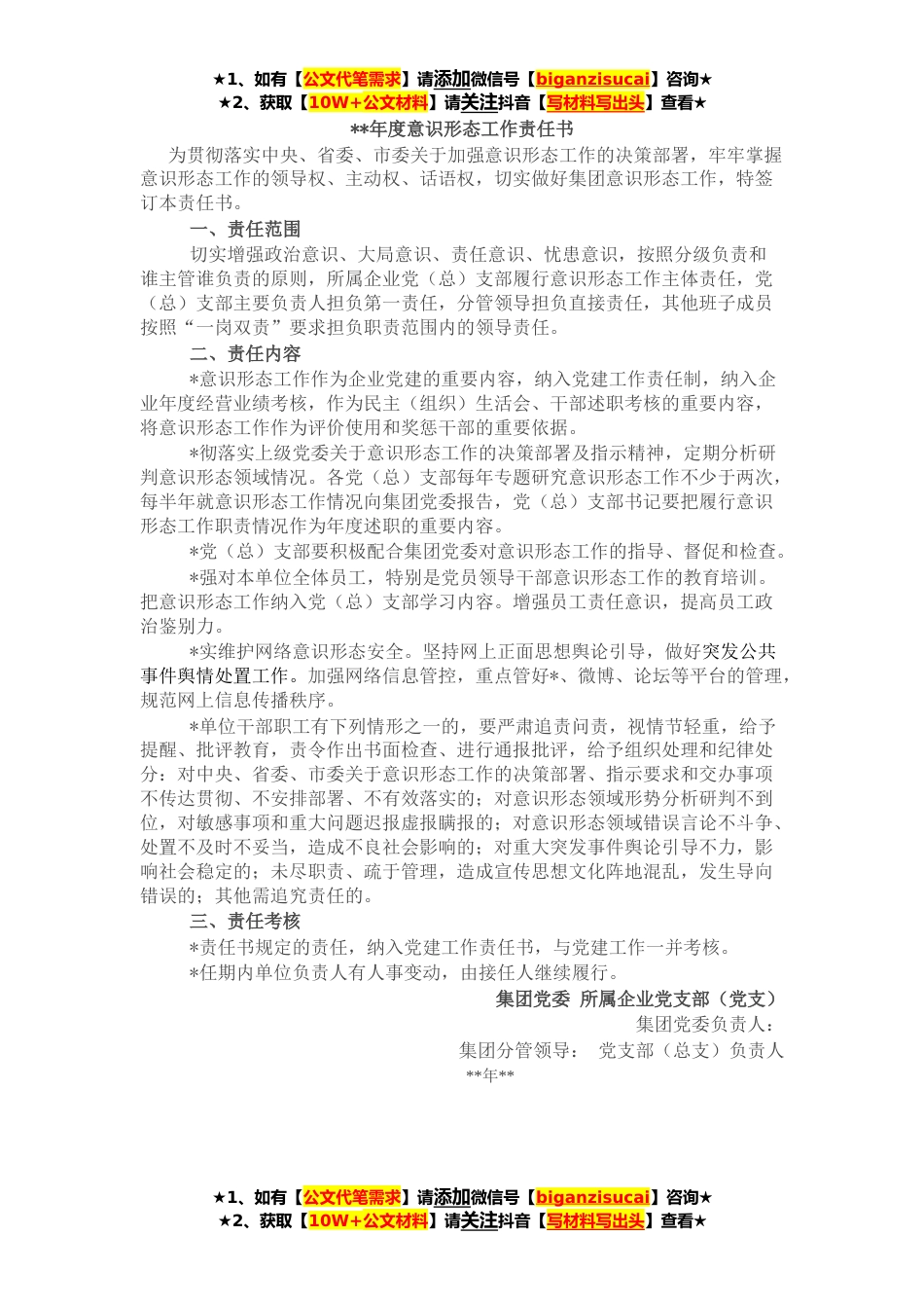 ★1、如有【公文代笔需求】请添加微信号【biganzisucai】咨询★★2、获取【10W+公文材料】请关注抖音【写材料写出头】查看★**年度意识形态工作责任书为贯彻落实中央、省委、市委关于加强意识形态工作的决策部署,牢牢掌握意识形态工作的领导权、主动权、话语权,切实做好集团意识形态工作,特签订本责任书。一、责任范围切实增强政治意识、大局意识、责任意识、忧患意识,按照分级负责和谁主管谁负责的原则,所属企业党(总)支部履行意识形态工作主体责任,党(总)支部主要负责人担负第一责任,分管领导担负直接责任,其他班子成员按照“一岗双责”要求担负职责范围内的领导责任。二、责任内容*意识形态工作作为企业党建的重要内容,纳入党建工作责任制,纳入企业年度经营业绩考核,作为民主(组织)生活会、干...