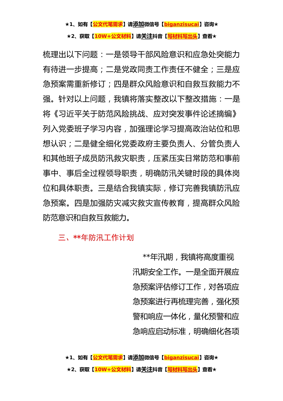 ★1、如有【公文代笔需求】请添加微信号【biganzisucai】咨询★★2、获取【10W+公文材料】请关注抖音【写材料写出头】查看★镇关于《**“*”特大暴雨灾害调查报告》学习贯彻落实情况的报告按照县应急委〔**〕*文件要求,我镇迅速组织传达学习了《**“*”特大暴雨灾害调查报告》,深刻吸取教训,举一反三,认真排查整治自身存在的各类问题和风险隐患,现将贯彻落实情况报告如下:一、传达学习情况《**“*”特大暴雨灾害调查报告》对****“*”特大暴雨灾害存在问题进行了深刻剖析,总结分析了重要经验教训并提出了宝贵的改进工作措施建议,我镇收到报告后,迅速转发到各村(社区)、各镇干部、辖区各企事业单位,要求各相关单位、责任人对调查报告进行学习。在党委会进行了传达学习,进一步提高党委班子成员责任意识...