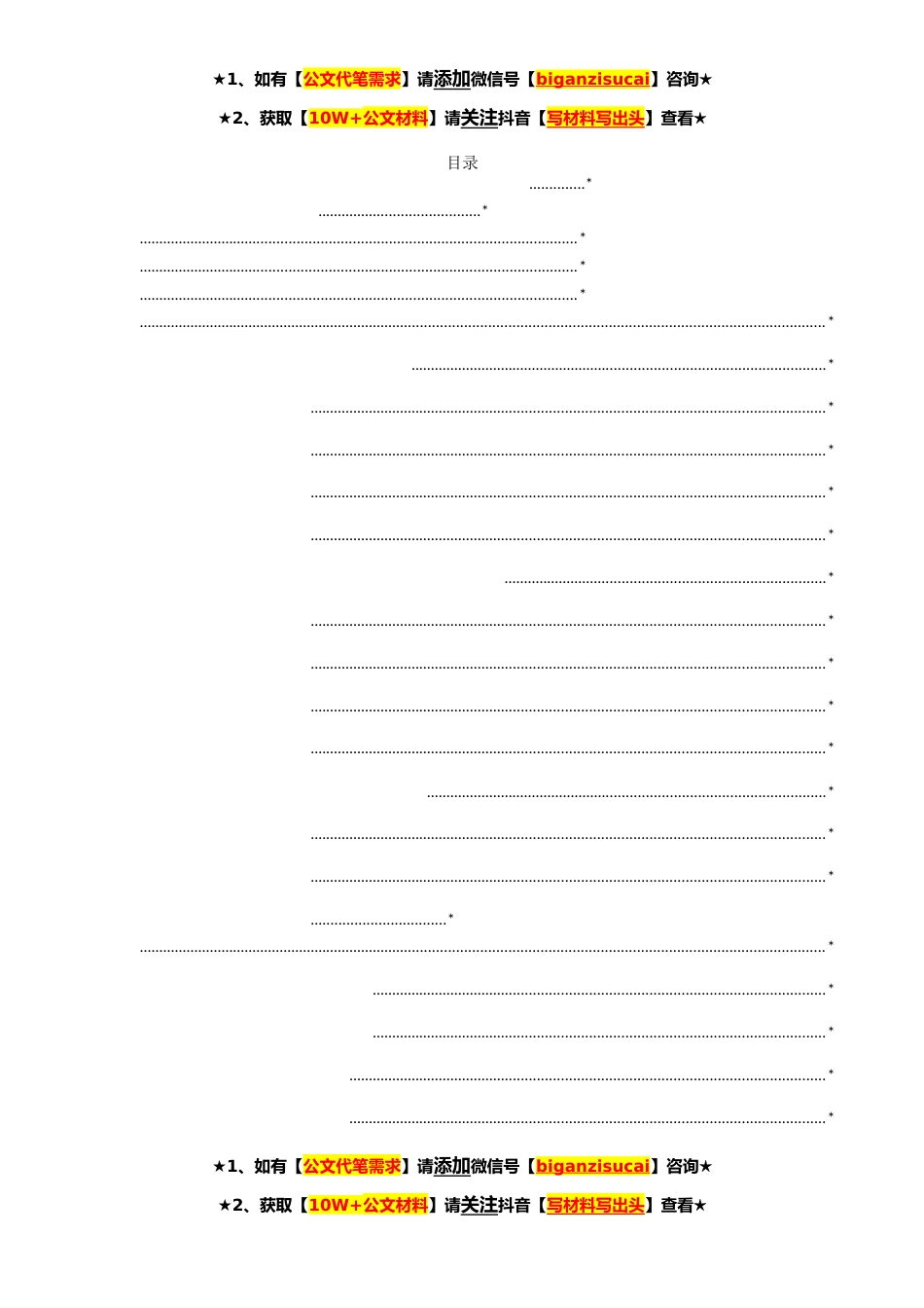 ★1、如有【公文代笔需求】请添加微信号【biganzisucai】咨询★★2、获取【10W+公文材料】请关注抖音【写材料写出头】查看★目录..............*.........................................*..............................................................................................................*..............................................................................................................*..............................................................................................................*............................................................................................................................................................
