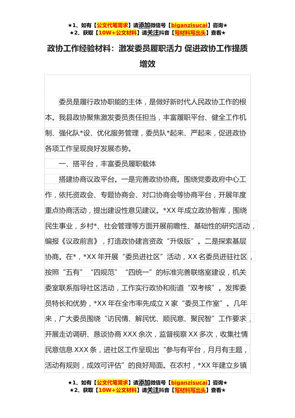 ★1、如有【公文代笔需求】请添加微信号【biganzisucai】咨询★★2、获取【10W+公文材料】请关注抖音【写材料写出头】查看★政协工作经验材料:激发委员履职活力促进政协工作提质增效委员是履行政协职能的主体,是做好新时代人民政协工作的根本。我县政协聚焦激发委员责任担当,丰富履职平台、健全工作机制、强化队*设、优化服务管理,委员队*起来、严起来,促进政协各项工作呈现良好发展态势。一、搭平台,丰富委员履职载体搭建协商议政平台。一是完善政协协商。围绕党委政府中心工作,依托资政会、专题协商会、对口协商会等协商平台,开展年度重点协商活动,提出建设性意见建议。*XX年成立政协智库,围绕民生事业,乡村*、社会管理等方面开展前瞻性、基础性的研究活动,编报《议政前言》,打造政协建言资政“升...
