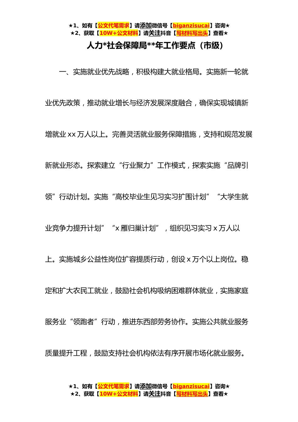 ★1、如有【公文代笔需求】请添加微信号【biganzisucai】咨询★★2、获取【10W+公文材料】请关注抖音【写材料写出头】查看★人力*社会保障局**年工作要点(市级)一、实施就业优先战略,积极构建大就业格局。实施新一轮就业优先政策,推动就业增长与经济发展深度融合,确保实现城镇新增就业xx万人以上。完善灵活就业服务保障措施,支持和规范发展新就业形态。探索建立“行业聚力”工作模式,探索实施“品牌引领”行动计划。实施“高校毕业生见习实习扩围计划”“大学生就业竞争力提升计划”“x雁归巢计划”,组织见习实习x万人以上。实施城乡公益性岗位扩容提质行动,创设x万个以上岗位。稳定和扩大农民工就业,鼓励社会机构吸纳困难群体就业,实施家庭服务业“领跑者”行动,推进东西部劳务协作。实施公共就业服...