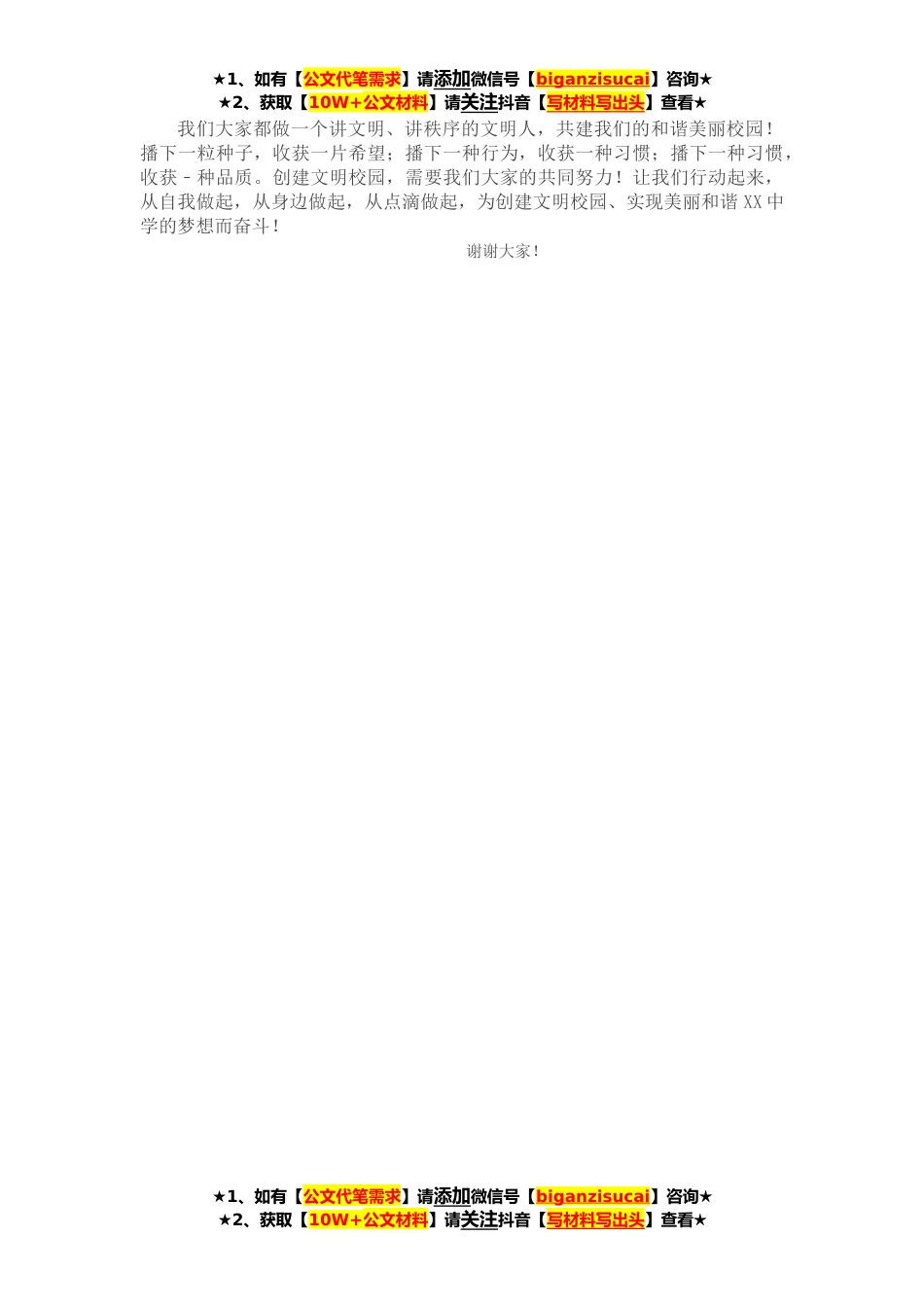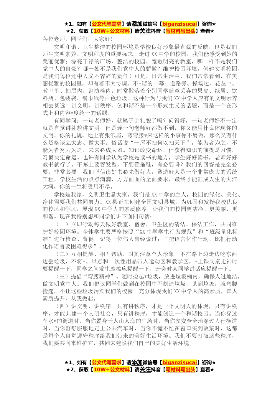 ★1、如有【公文代笔需求】请添加微信号【biganzisucai】咨询★★2、获取【10W+公文材料】请关注抖音【写材料写出头】查看★各位老师,同学们,大家好!文明和谐、卫生整洁的校园环境是学校良好形象最直观的反映,也是我们师生文明素养、文明程度的重要标志。走进XX中学的校园,我们能感受到她的美丽优雅;漂亮干净的广场、整洁的校园、宽敞明亮的教室,哪一样不是我们党中人的自豪?哪一处不是我们党中人的骄傲?维护校园环境,创建文明校园,是我们每位党中人义不容辞的责任!可是,日常生活中,我们常常看到,在美丽优雅的校园里,却有着不太协调、不*谐的一幕:道路旁、操场边、花丛中、教室里、抽屉内,消防栓内,时常散落着个别同学随意丢弃的果皮、纸屑、饮料瓶、包装袋、餐巾纸等白色垃圾。这种行为与我们...