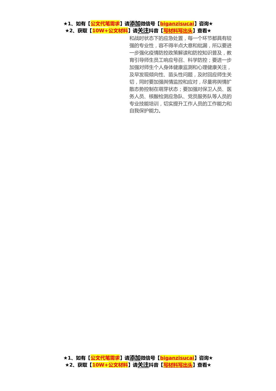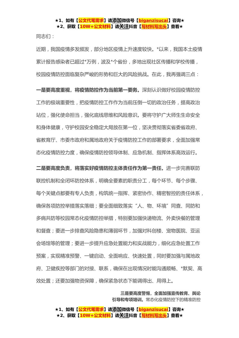 ★1、如有【公文代笔需求】请添加微信号【biganzisucai】咨询★★2、获取【10W+公文材料】请关注抖音【写材料写出头】查看★同志们:近期,我国疫情多发频发,部分地区疫情上升速度较快。*以来,我国本土疫情累计报告感染者已超过*万例,波及*个省份,多地出现社区传播和学校传播,校园疫情防控面临复杂严峻的形势和巨大的风险挑战。在此,我再强调三点:一是要高度重视,将疫情防控作为当前第一要务。深刻认识做好校园疫情防控工作的极端重要性,把疫情防控工作作为当前压倒一切的政治任务,提高政治站位,强化使命担当,强化底线思维和风险意识。要将守护广大师生生命安全和身体健康,守护校园安全稳定大局放在第一位,坚决贯彻落实省委省政府、省教育厅、市委市政府和属地政府关于疫情防控工作的部署要求,全面...