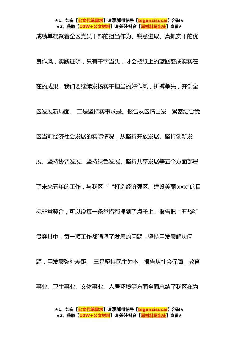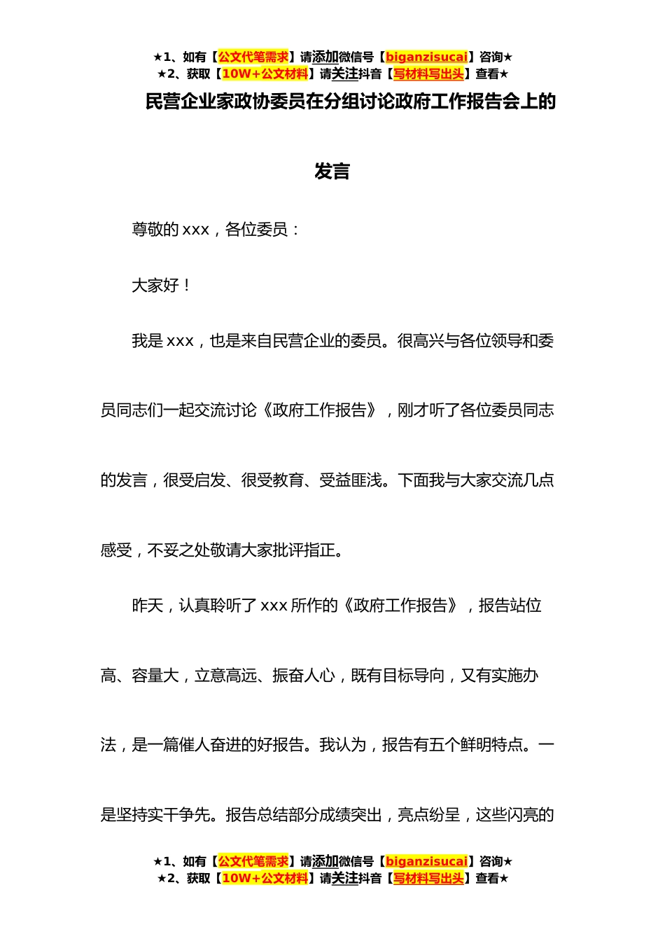 ★1、如有【公文代笔需求】请添加微信号【biganzisucai】咨询★★2、获取【10W+公文材料】请关注抖音【写材料写出头】查看★民营企业家政协委员在分组讨论政府工作报告会上的发言尊敬的xxx,各位委员:大家好!我是xxx,也是来自民营企业的委员。很高兴与各位领导和委员同志们一起交流讨论《政府工作报告》,刚才听了各位委员同志的发言,很受启发、很受教育、受益匪浅。下面我与大家交流几点感受,不妥之处敬请大家批评指正。昨天,认真聆听了xxx所作的《政府工作报告》,报告站位高、容量大,立意高远、振奋人心,既有目标导向,又有实施办法,是一篇催人奋进的好报告。我认为,报告有五个鲜明特点。一是坚持实干争先。报告总结部分成绩突出,亮点纷呈,这些闪亮的★1、如有【公文代笔需求】请添加微信号【bigan...