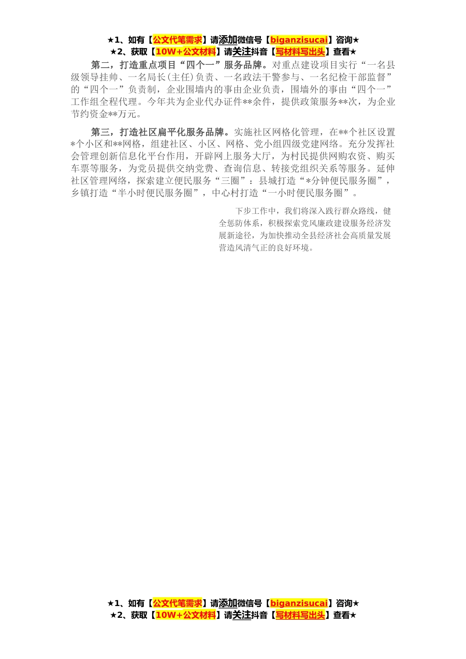 ★1、如有【公文代笔需求】请添加微信号【biganzisucai】咨询★★2、获取【10W+公文材料】请关注抖音【写材料写出头】查看★作风建设和反腐倡廉工作事关发展全局,事关党的形象。今年以来,XX县切实加强作风建设和反腐倡廉工作,为全县经济社会发展提供了坚强保障。一、以贯彻落实“中八条”为突破口,健全“三项机制”第一,健全约束机制。出台《关于改进工作作风、密切联系群众的八条意见》,从密切联系群众、加强廉洁自律、严肃工作纪律等十个方面进行了明确规定,配套出台《XX县公务接待暂行办法》、《XX县县级会议费管理办法》等规定,强化纪律约束,加大执行力度,促进廉洁从政。第二,健全监督机制。一是开展“双十”评比,强化群众监督。按照“奖励注重基层,表彰瞄准一线”的原则,对群众满意度最佳的十...